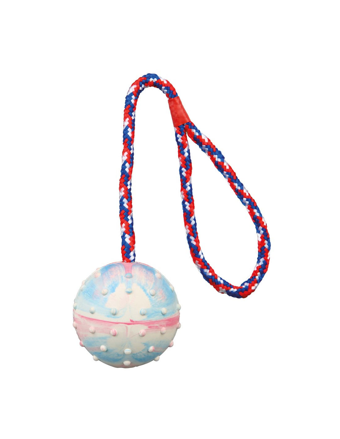Gummiboll med rep, tillverkad i naturgummi. Rejäl boll för roliga lekar med hunden
