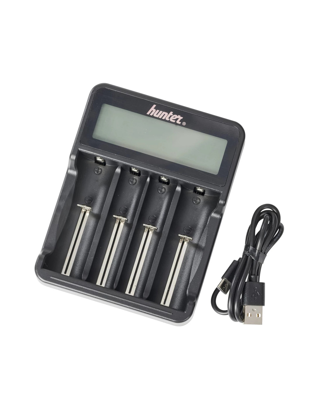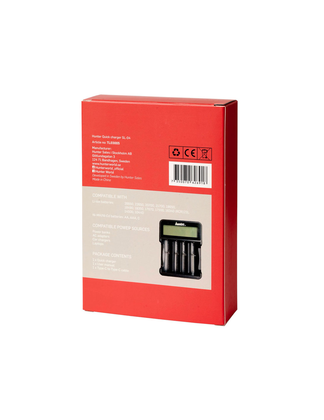 Maximera prestandan hos dina uppladdningsbara batterier med Hunter Snabbladdare SL-04. Denna kraftfulla laddare kan ladda upp till fyra batterier samtidigt och är kompatibel med en mängd olika batterityper, inklusive 18650 Li-ion, Ni-MH och Ni-Cd.