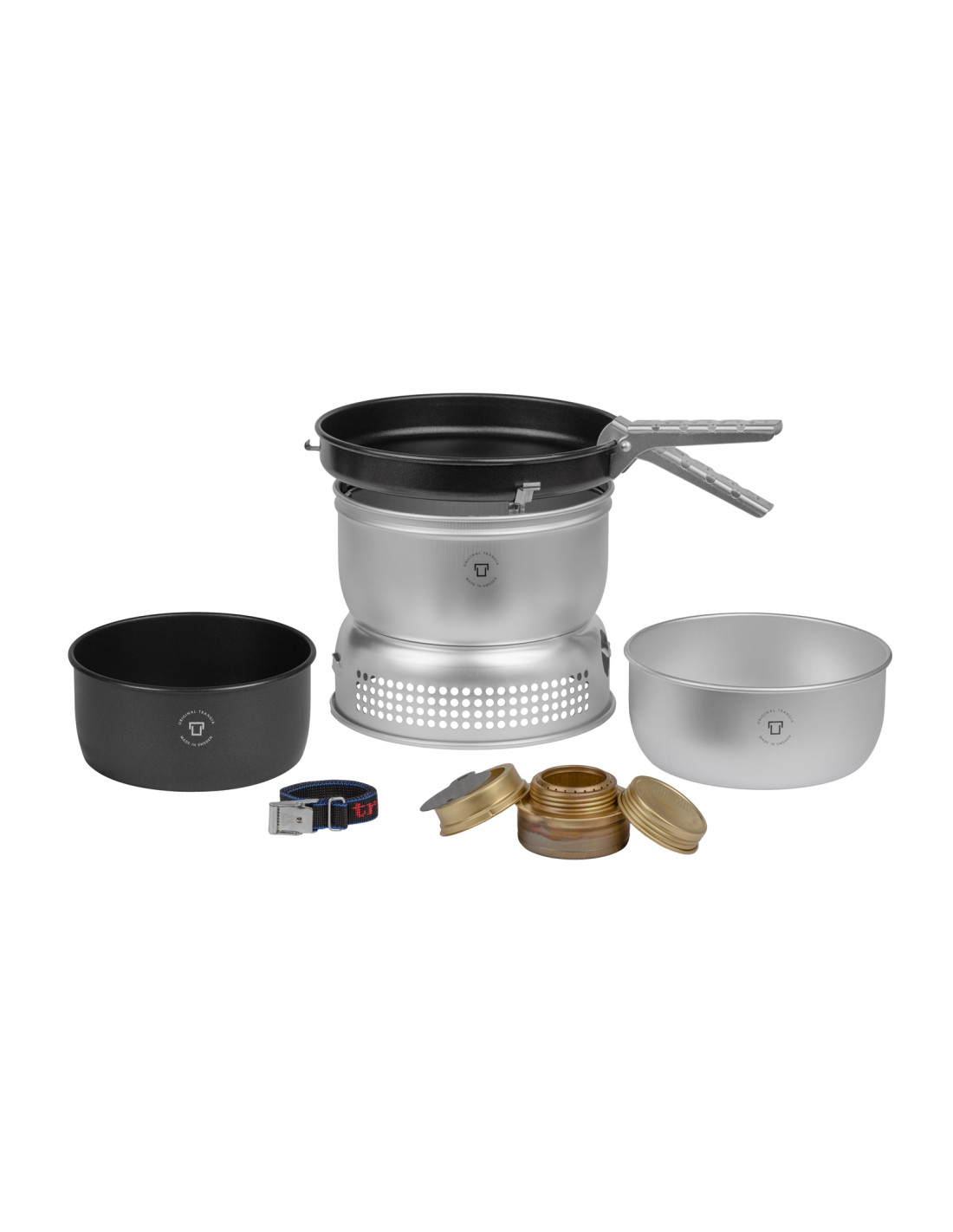 Alla Trangias kök i serie 25 innehåller två kittlar i storlek 1.75 och 1.5 liter, en stekpanna, ett vindskydd (övre och nedre del), brännare, handtag och rem. Kaffepanna 0.9 liter ingår beroende på modell, och du kan välja mellan sprit eller gasbrännare. I sortimentet finns flera kompletta kombinationer med olika material på vindskydd och olika kombinationer av material i kastruller och stekpanna.