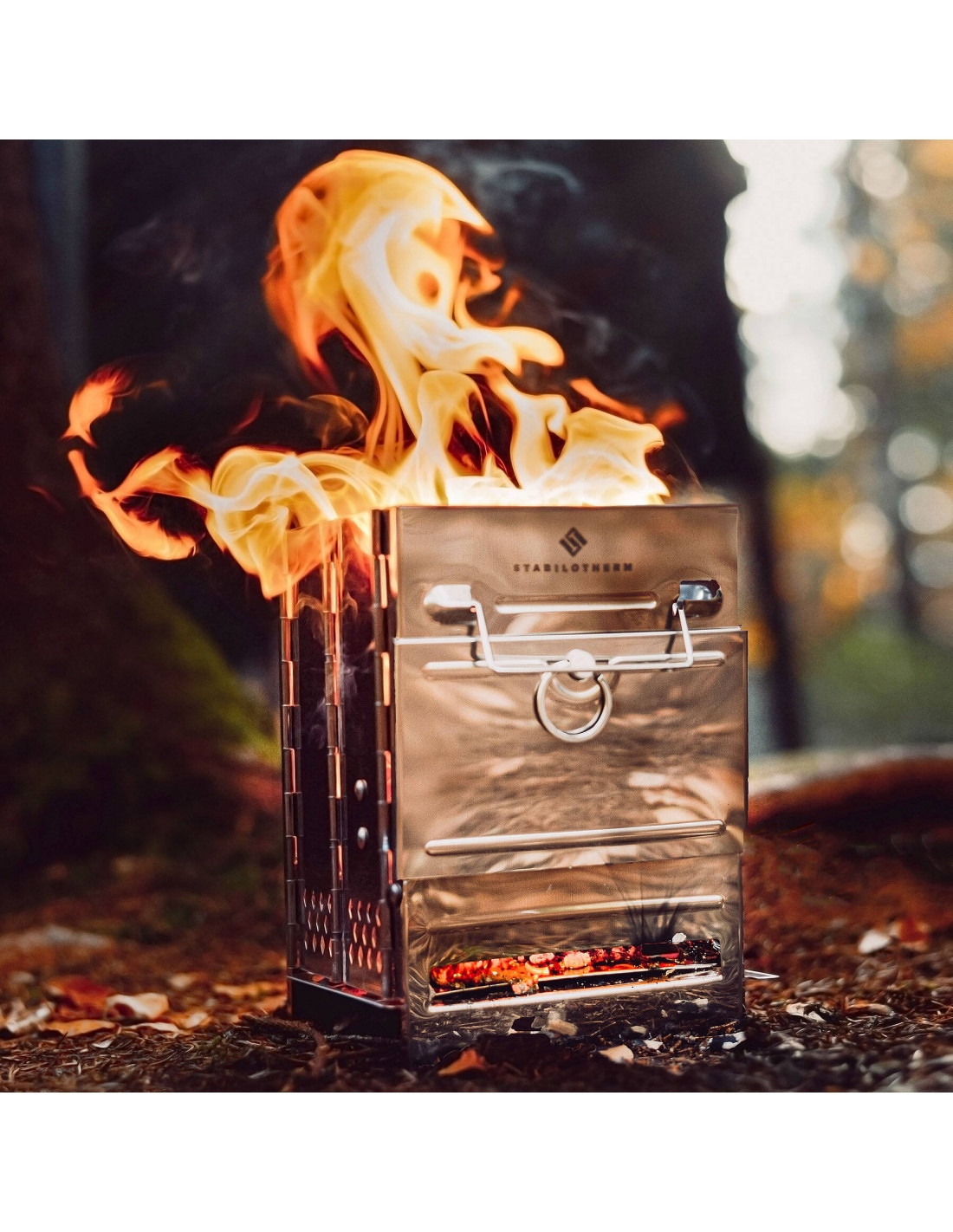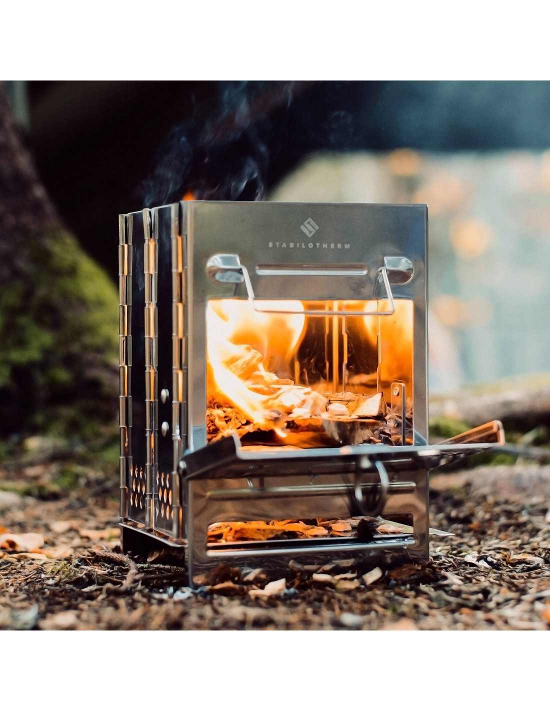 Det är enkelt att fylla på med bränsle från sidan under tiden maten lagas. Wood Stove Tower är väldigt snabb och enkel att montera ihop. Ihopvikt är den inte mycket större än en bok. En praktisk förvaringsväska medföljer för enkel transport.