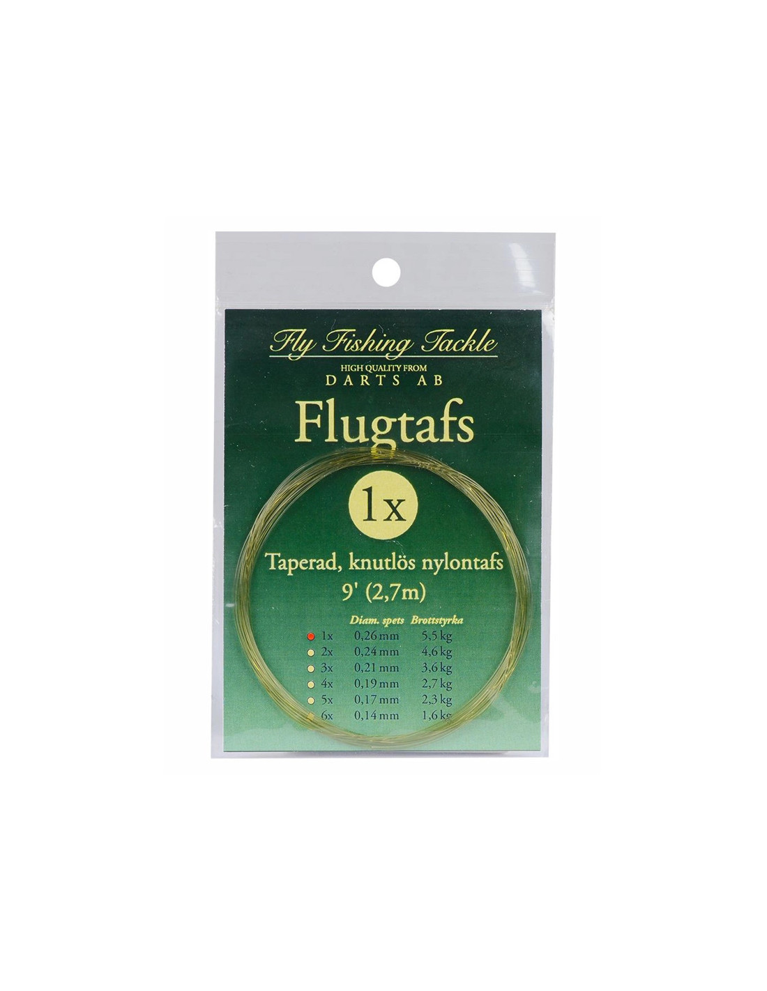 Darts Flugtafs är en taperad nylontafs från japan som finns i storlekarna 1x, 2x, 3x, 4x, 5x och 6x. De är 9 fot långa. Darts Flugtafsar har en bra knutstyrka och sträcker ut väldigt bra utan att få ett högt linminne. Detta i kombination med resistensen mot solljus gör att de tåls att fiska väldigt länge med. Komplettera gärna med Kamasan Fly Cast Leader som tafsspets och du har en perfekt flugtafs!