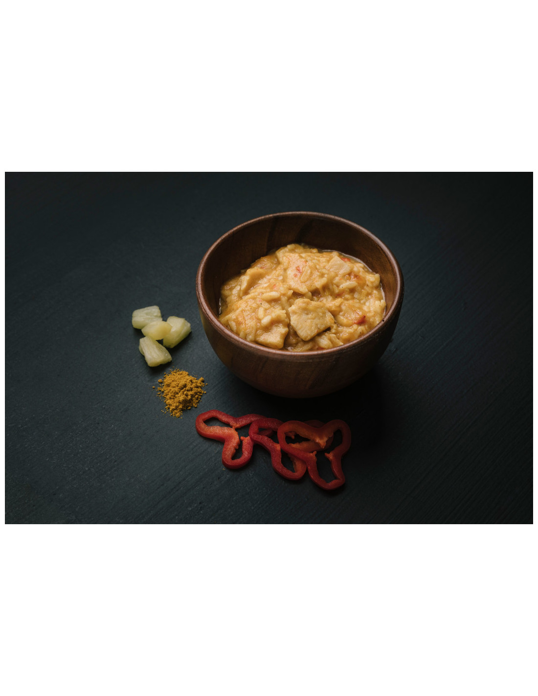 Ris, lök, 11,4 % formad kyckling (89 % kyckling, salt, peppar, stabiliseringsmedel (E450)), 11,1 % paprika, rapsolja, 7,4 % ananas, vetemjöl , majsstärkelse, kycklingbuljong (arom, maltodextrin, kyckling, 0, jästextrakt, 8 %, salt), (curry), salt, jästextrakt, % ) , krydda, antioxidant (rosmarinextrakt, askorbinsyra).