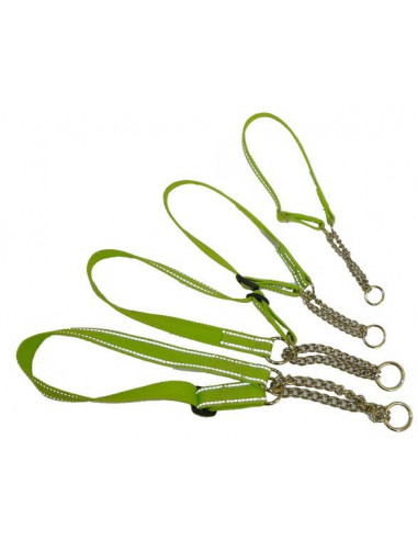 Svensktillverkad. Reflexpolyhalvstryp neongrön med 2 invävda reflextrådar. Med kraftig triangelkedja.