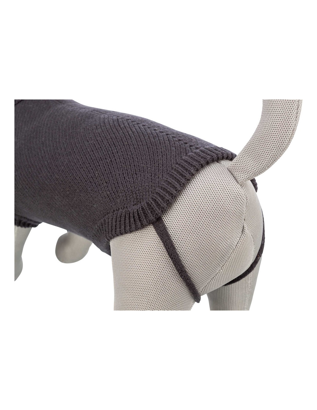 Baktill finns 2 band att sätta runt bakbenen så att tröjan inte åker upp på ryggen.