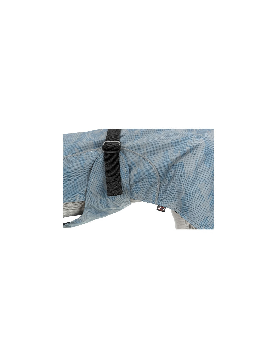 Regntäcket är helt vattentätt och ofodrat. På ryggen finns en vattentät dragkedja som du kan öppna för att fästa kopplet i halsbandet eller selen. För bästa passform har täcket dragsko vid halsen. Justerbar magrem med klickspänne. För att täcket ska sitta på plats finns justerbara remmar som fästs runt bakbenen.