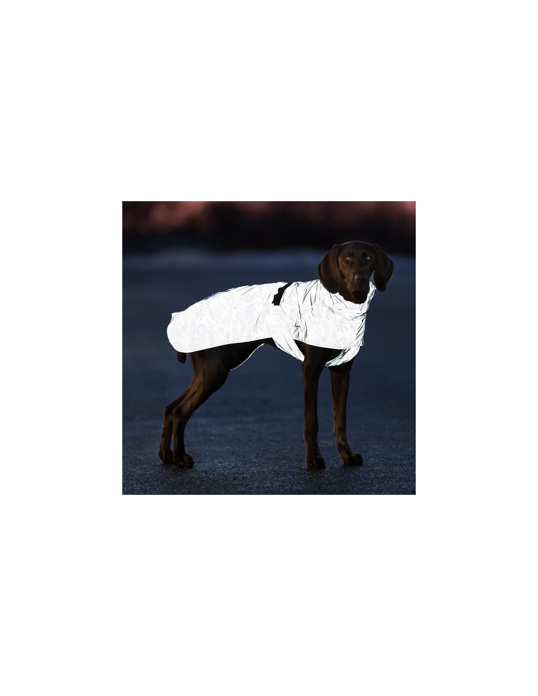 Trixie Lunas är ett snyggt, silverblått regntäcke helt i reflextyg. Reflextyget gör att din hund syns fantastiskt bra och mörkerpromenaderna blir tryggare.