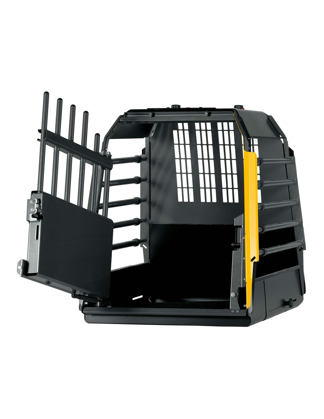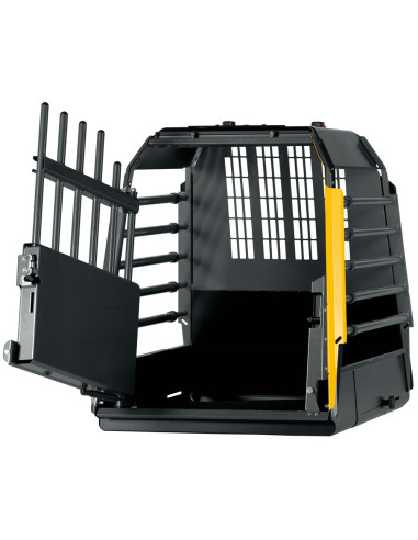 Dörren på VarioCage stängs i två steg för att garantera att hundburen förblir stängd vid en krock. Precis som dörren på en bil.
