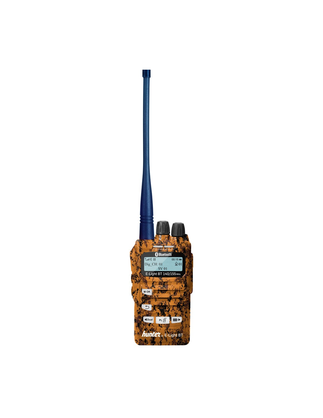 Hunter E-Light Bluetooth är en analog-digital radio med blåtand samt de viktigaste funktionerna och lättnavigerade menyer på norska och svenska. Bra funktioner är kryptering samt Dual Watch som innebär tvåkanalspassning så hundförarna kan prata ostört, då det finns en huvudkanal och en sekundär kanal som tex hundförarna kan använda sig av. Detta är en specialmodell med ett exklusivt och unikt camouflage färgat chassi. I superpaketet ingår dubbla batterier, öronmussla, intelligent bordsladdare och en 12V laddkabel för laddning i bil.