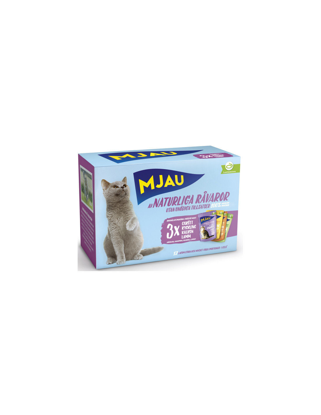 Mjau enportion tolvpack köttsmak innehåller smakerna oxkött, kyckling, kalkon och lamm. Varje måltid innehåller 85 gram bitar i gelé. Varje smak är kärleksfullt tillagad med naturliga råvaror. Maten innehåller 100% animaliska proteiner utan varken tillsatt socker eller spannmål.