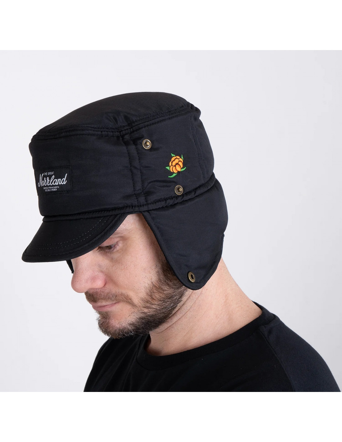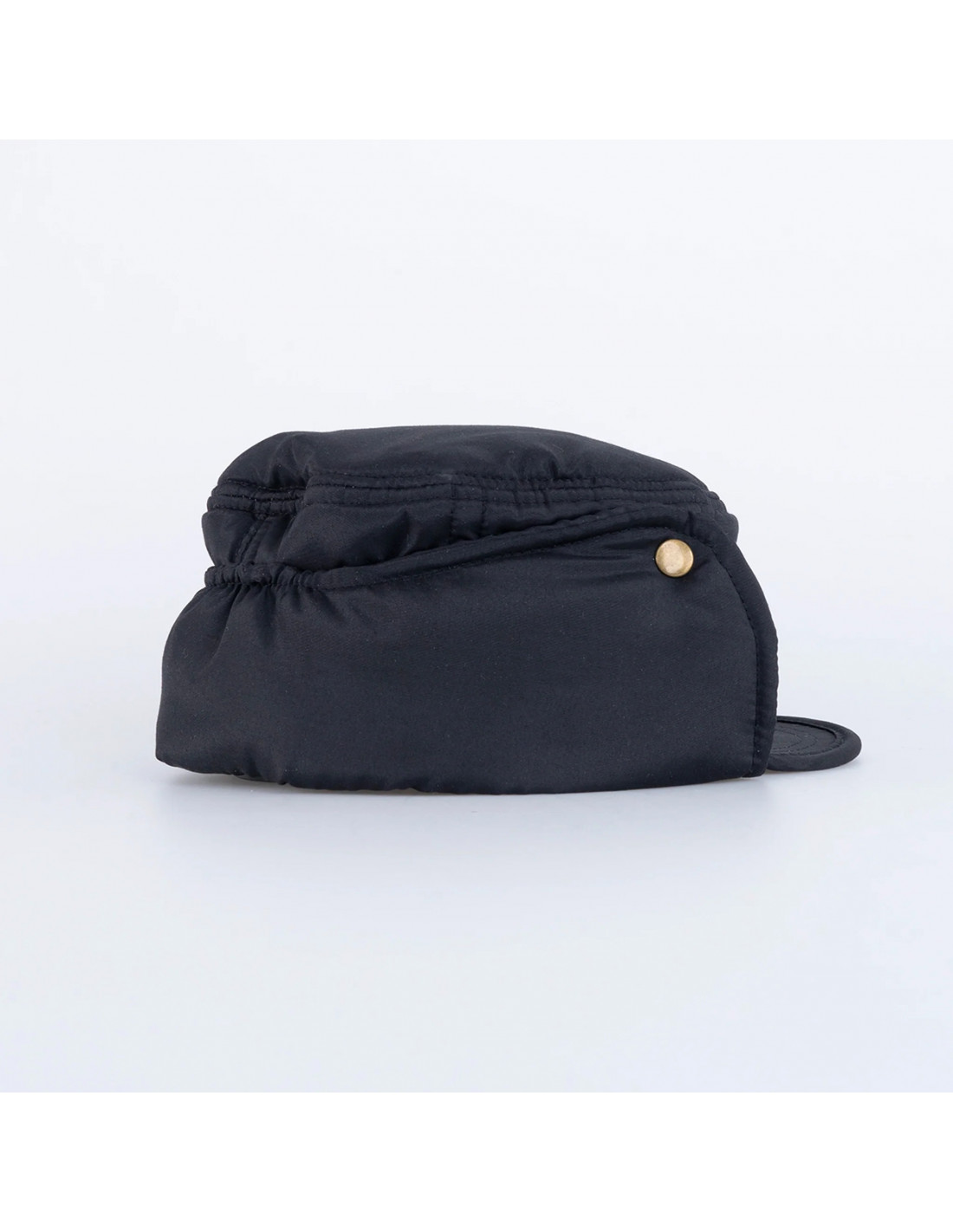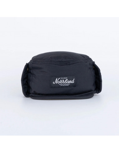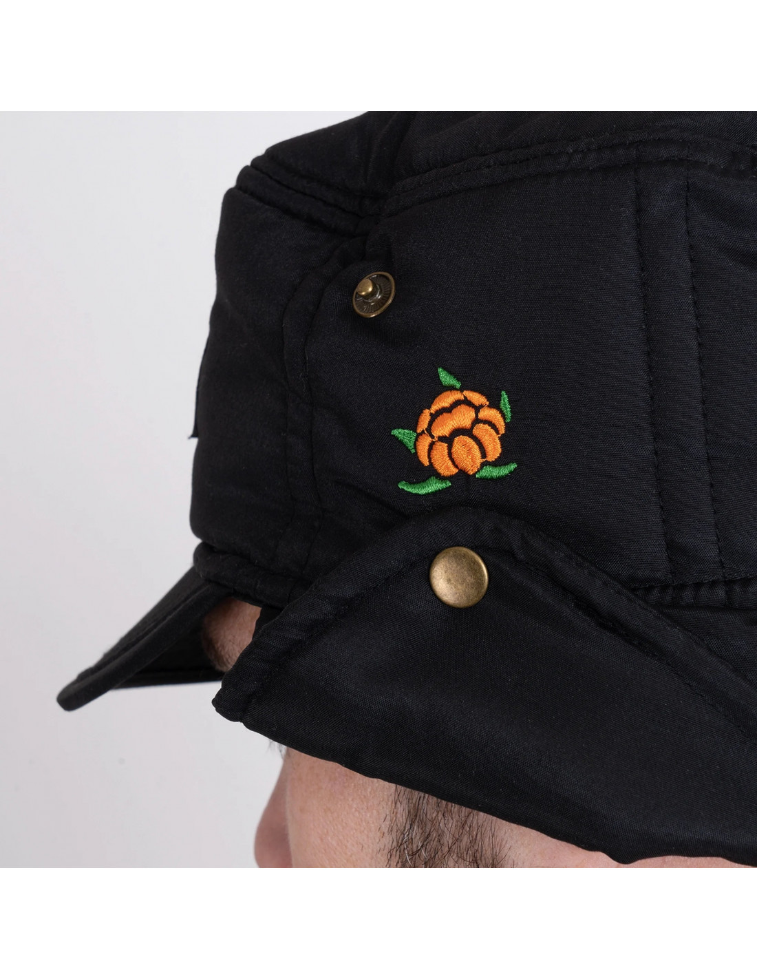 Vadderad keps i mjukt material med brodyrer på flera ställen.