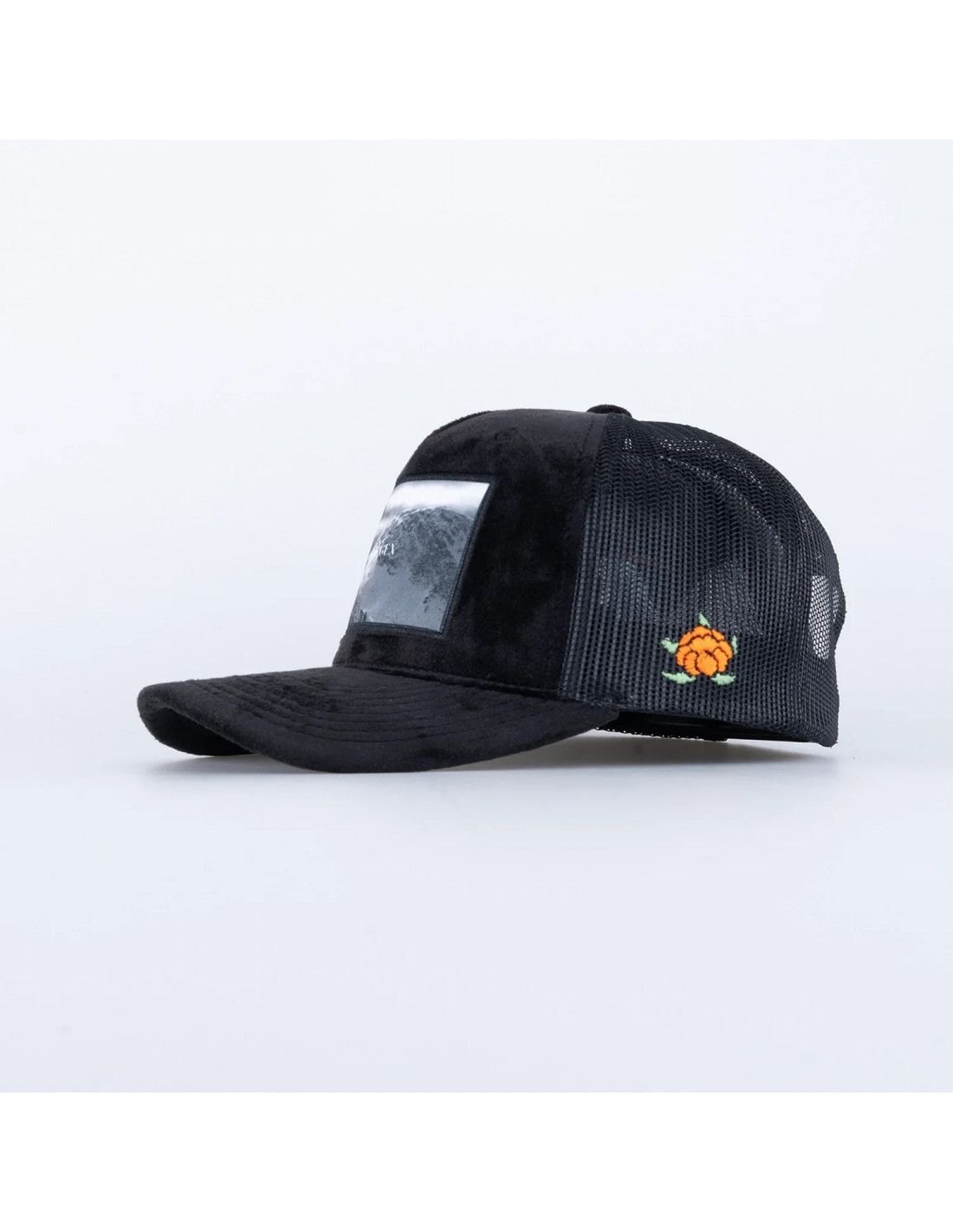 Snapbackkeps i sammetsmaterial med brodyrer på flera ställen.