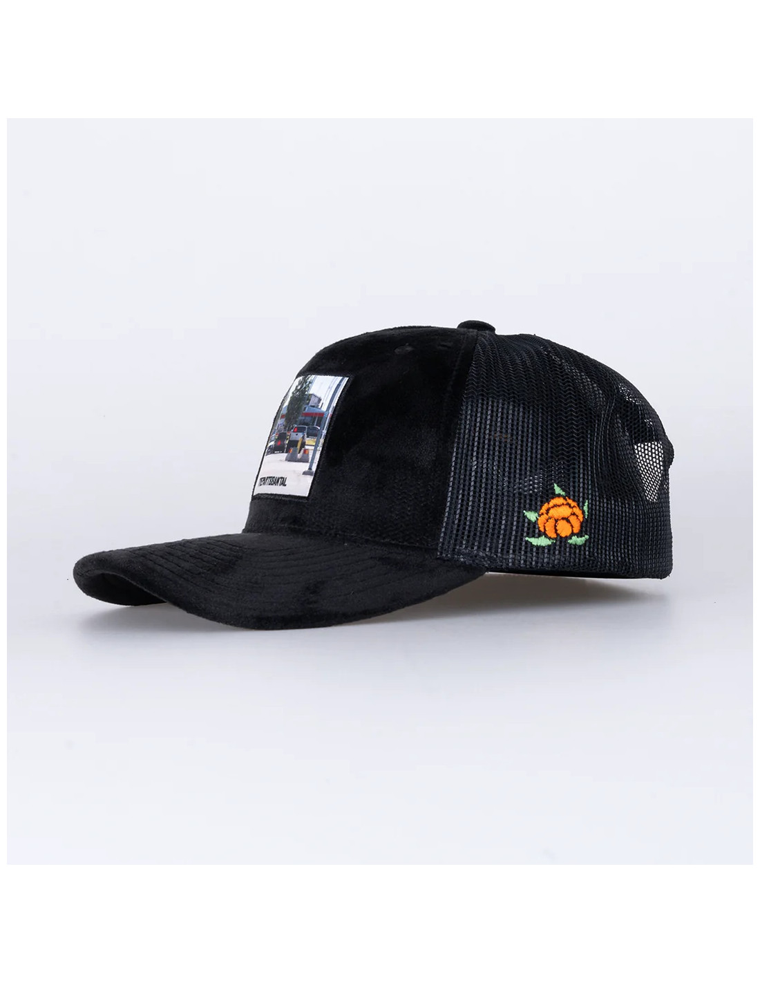 Snapbackkeps i sammetsmaterial med brodyrer på flera ställen.