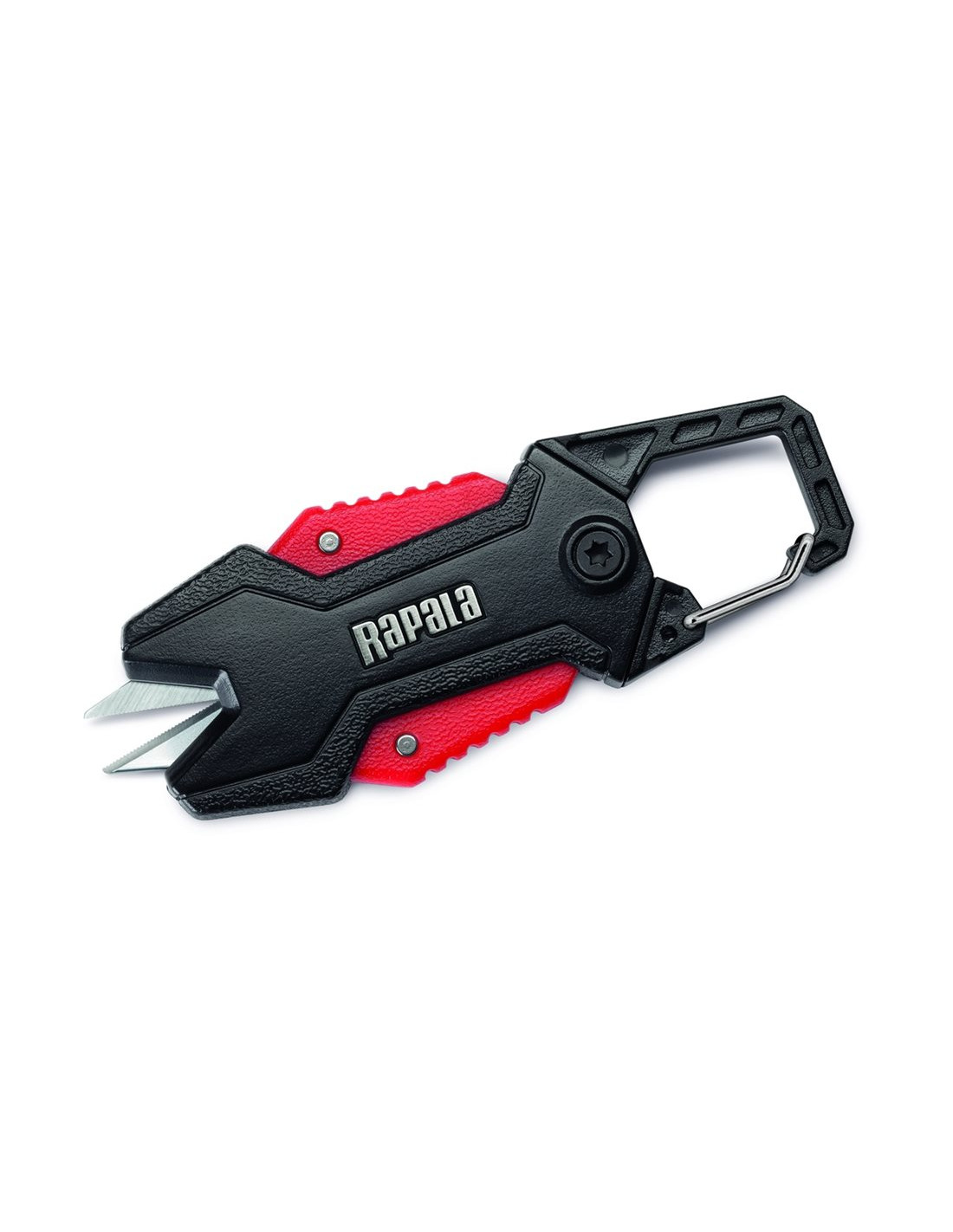 Sax för både flät- och nylonlina med vasst rostfritt blad. Saxen är utrustad med en säkerhetsfunktion som gör att knivbladen dras tillbaks efter användandet. Praktisk karbinhake för att kunna fästa saxen på kläderna eller ryggsäcken. Perfekt verktyg för alla sportfiskare!