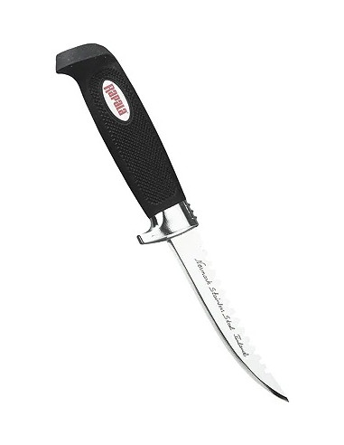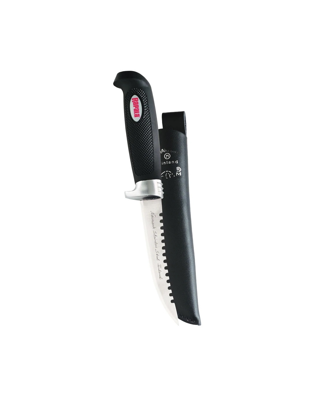 Marttiini Fiskekniv Rapala med tandad rygg, mjukt handtag som ger ett säkert grepp. Lev. med svart slida. Bladlängd: 11,5 cm.