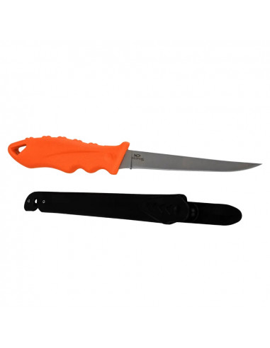 Goldfish Filékniv är en följsam filékniv i rostfritt stål med vass egg och strukturerat och greppvänligt non slip-handtag. Filékniven har ett behändigt bryne på slidan som gör att du kan vässa din kniv vart du än är. Goldfish Filékniv är en rejäl kniv som är både smidig och användarvänlig.