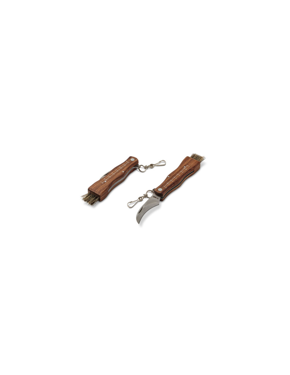 Svampkniv med vikbart knivblad och handtag i trä. Kniven är försedd med borste som effektivt avlägsnar jord och annat skräp från svampen. Nu med mätskala på ena sidan. Knivbladet är mycket vasst och kniven bör därför förvaras utom räckhåll för barn.