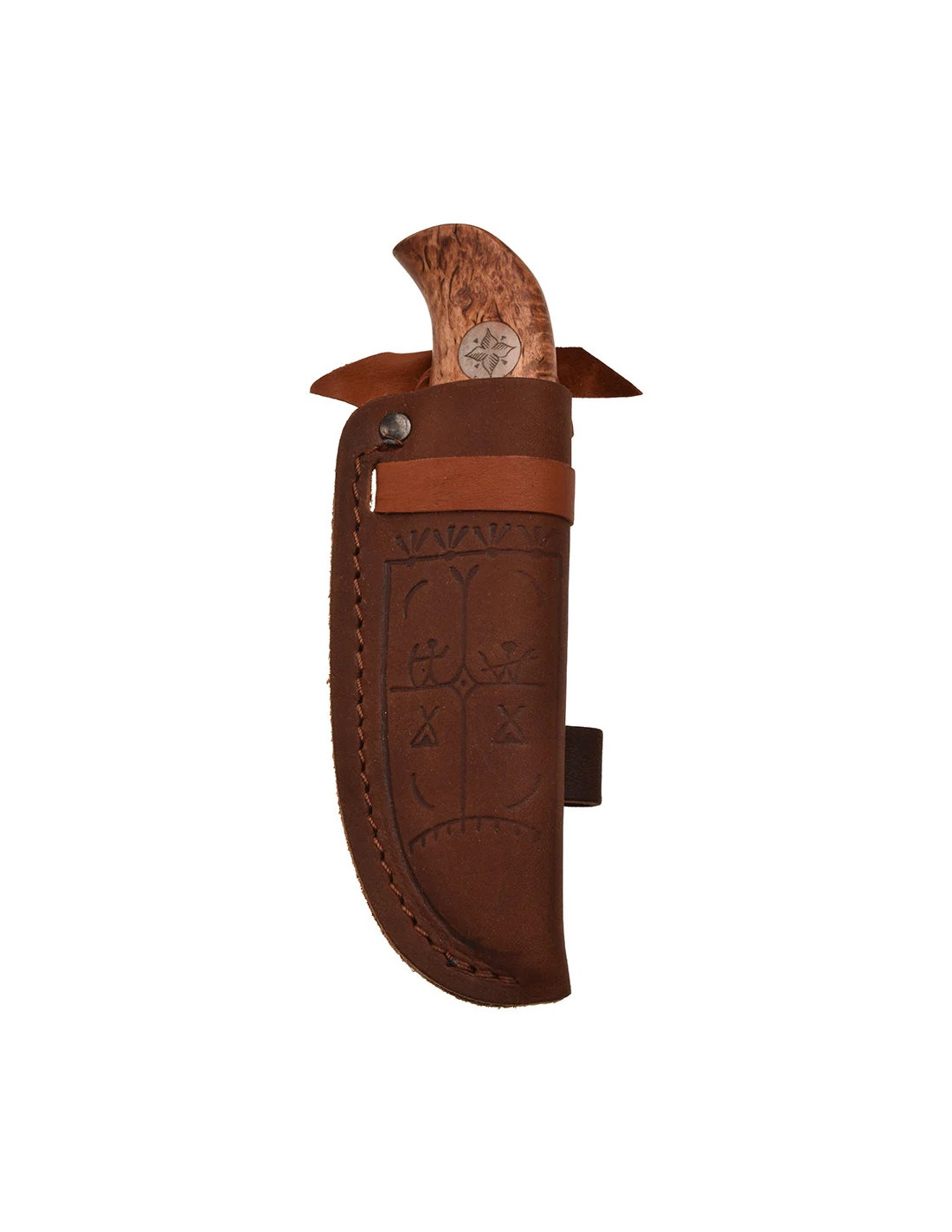 Renhornsinlägget är en stilfull detalj i skaftet som annars är både elegant och skönt att hålla i. Den dekorerade knivslidan i brunt läder går att fästa på flera sätt för att den ska vara lätt att nå men inte vara i vägen. Den kan till exempel fästas hängande vertikalt och horisontellt i skärpet eller på en ryggsäck.
