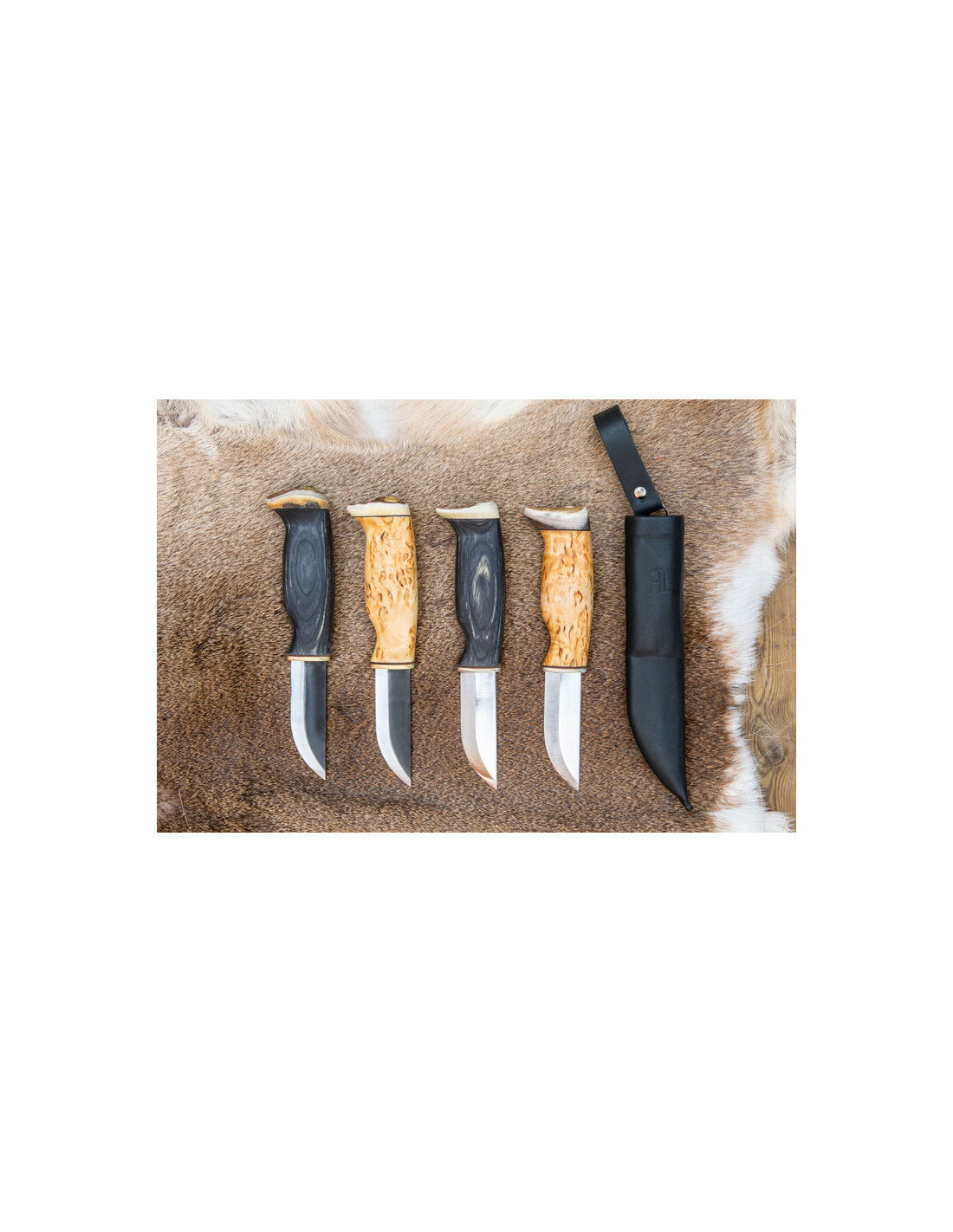 Jägarens favorit. Kolstålsblad på 9 cm med handtag i Masurbjörk och renhorn.
