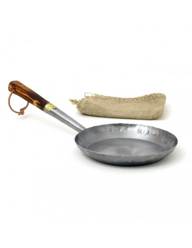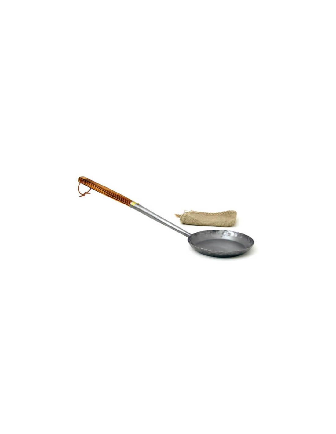 Kolbullepannan är tillknycklad 1 mm järnplåt som försetts med ett brunbränt träskaft med lädersnöre i.