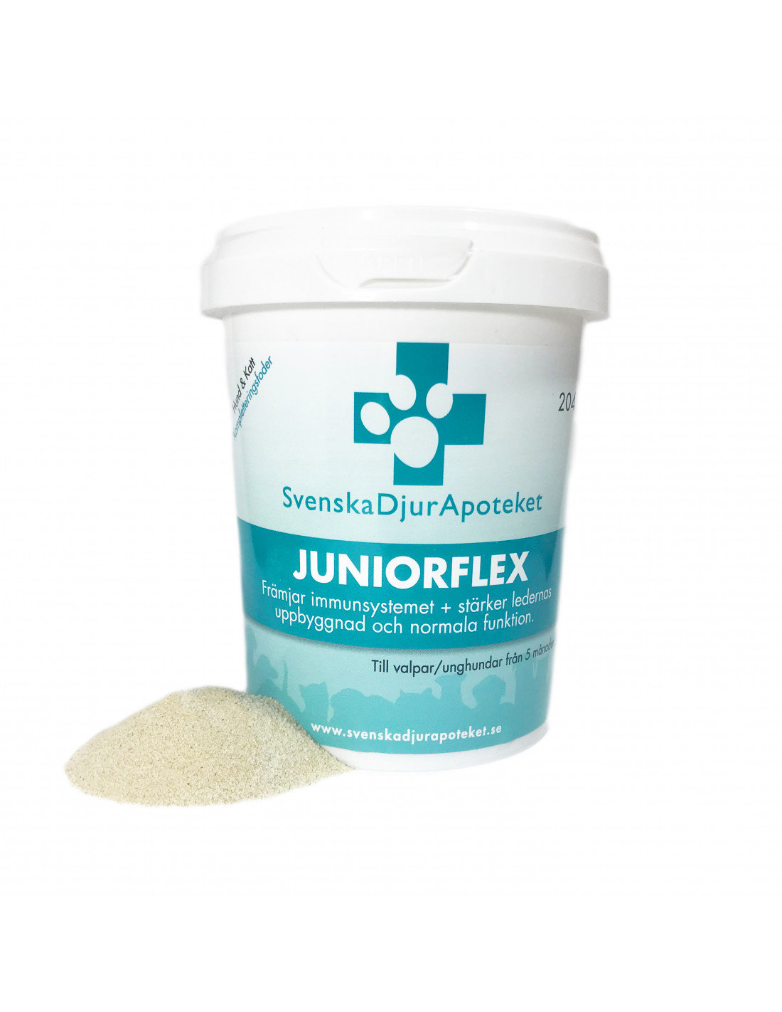 Svenska DjurApotekets JuniorFlex är framtagen till valpar från 5 månader samt unghundar. JuniorFlex innehåller Grönläppad Mussla och C-vitamin. För ledernas uppbyggnad, funktion och är byggstenar för ledbrosket. Vår C-vitamin(kalciumaskorbat) är skonsam för magen och stöttar immunsystemet.