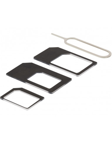 Förpackningen innehåller: Nano till Micro adapter, Nano till Mini adapter, Micro till Mini adapter samt öppnare för sim-korts hållare.