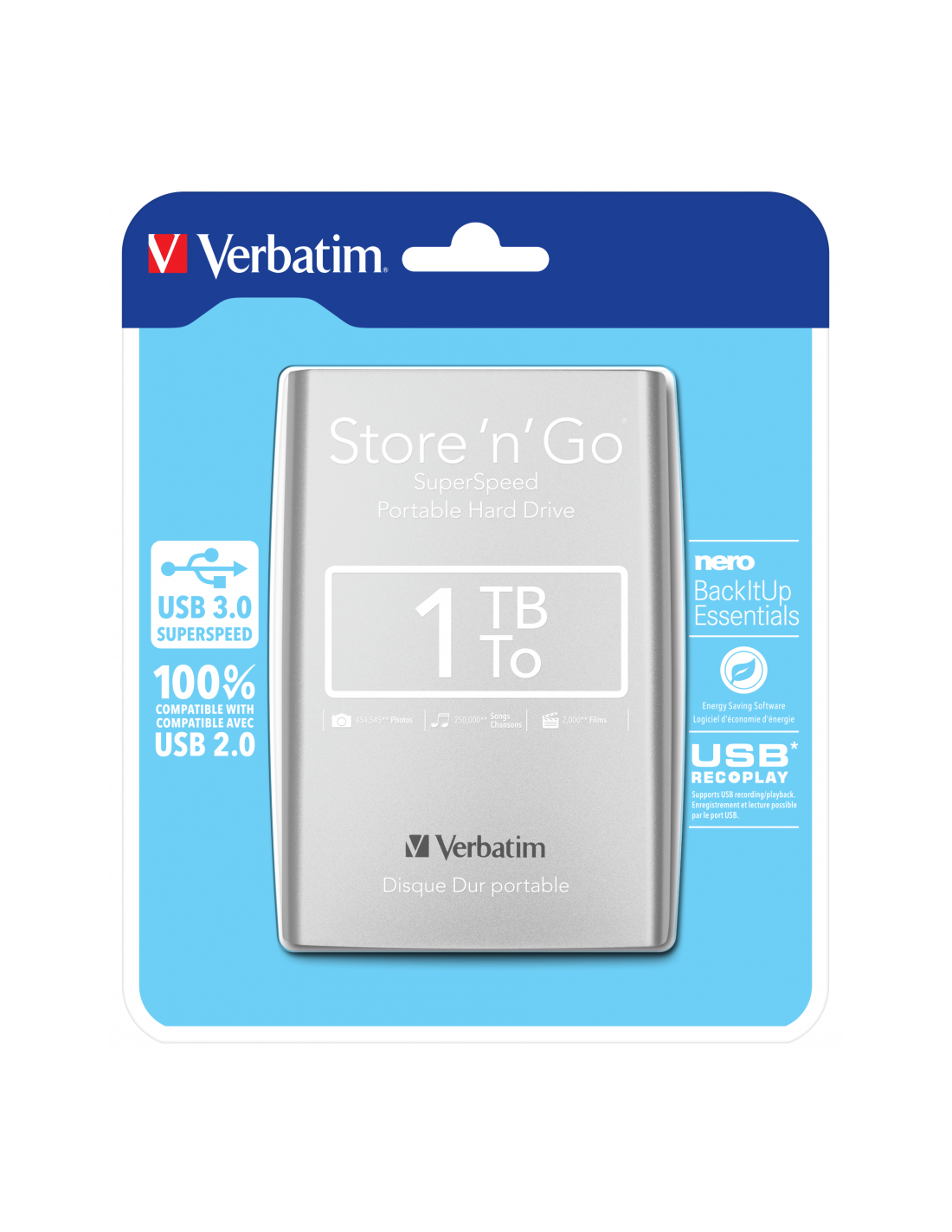 Verbatims bärbara hårddisk Store n Go har hög prestanda tack vare ett USB 3.0 "Super Speed"-gränssnitt. USB 3.0 ger upp till 10 gånger snabbare dataöverföringshastigheter jämfört med USB 2.0 (baserat på USB-busshastighet) och ger ultrasnabb, portabel dataöverföring.