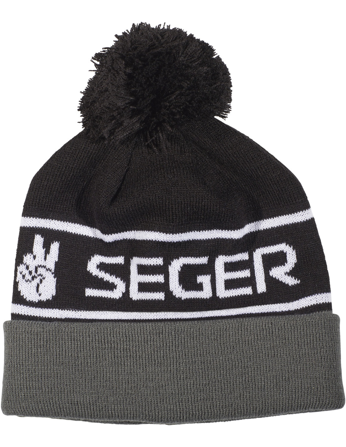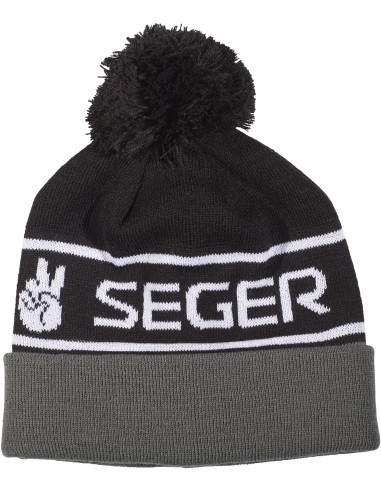 Stickad mössa med uppvik med boll på toppen.