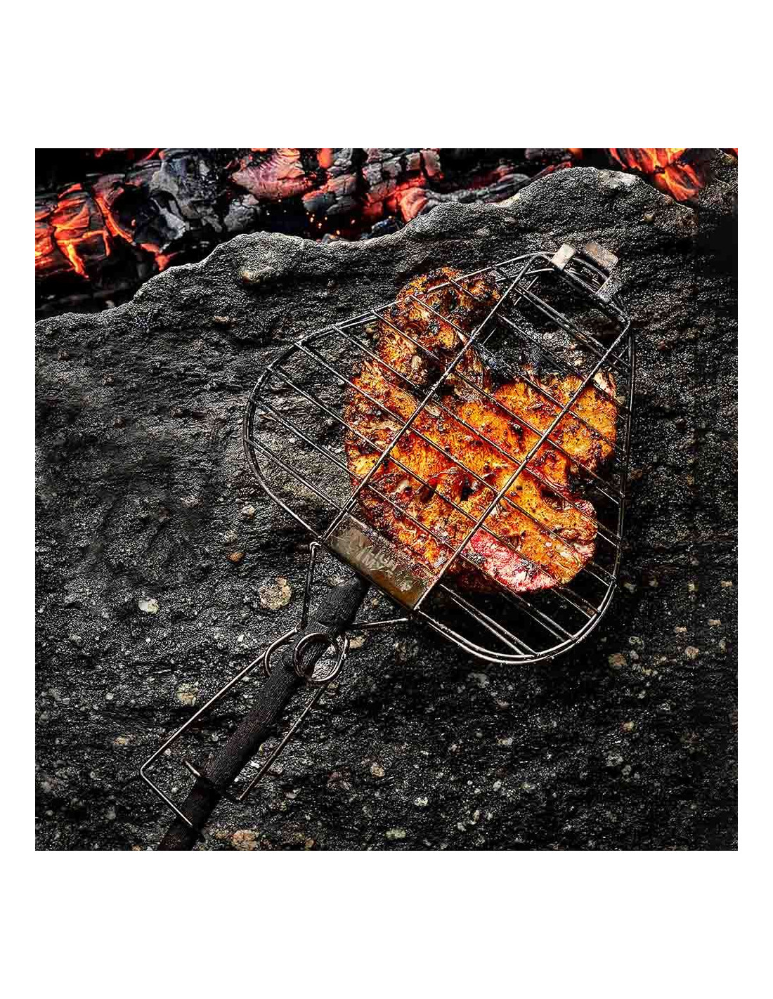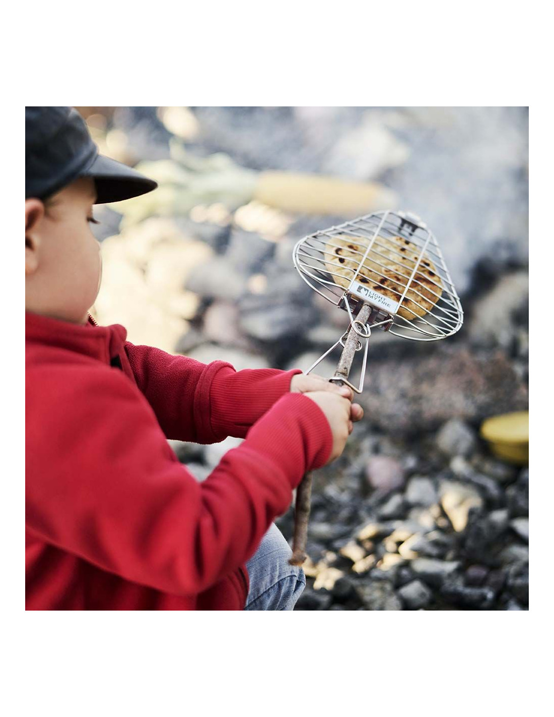 TILLSÄTT ENDAST EN PINNE Grandpas FireGrill är ett praktiskt redskap för dina heta rätter över öppen eld. Tillsätt endast en pinne (plocka gärna från marken, det finns ingen anledning att kapa friska grenar), fyll det med allt från grönsaker till nyfångad fisk. Den dubbla stängningsmekanismen gör att maten hålls på plats och grillas jämnt. JUSTERBAR HÖJD Grandpa's FireGrill har justerbar höjd och kan anpassas efter storleken på det du tillagar. HALSTER Lås det hopvikta gallret och använd det som halster. SÅ GÖR DU Upptäck Grandpa´s FireGrill. Välj ut en stadig och rak pinne. Fäst den i grillgallrets hållare. Ska maten tillagas på det öppna gallret – lås det i detta läge innan du placerar maten på det. Vill du använda gallret som halster, placera maten i den ena delen och vik över den andra – lås. Njut av din middag, nylagad över öppen eld.
