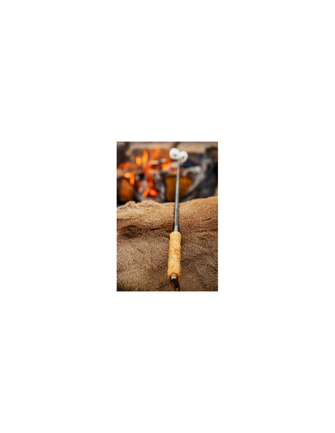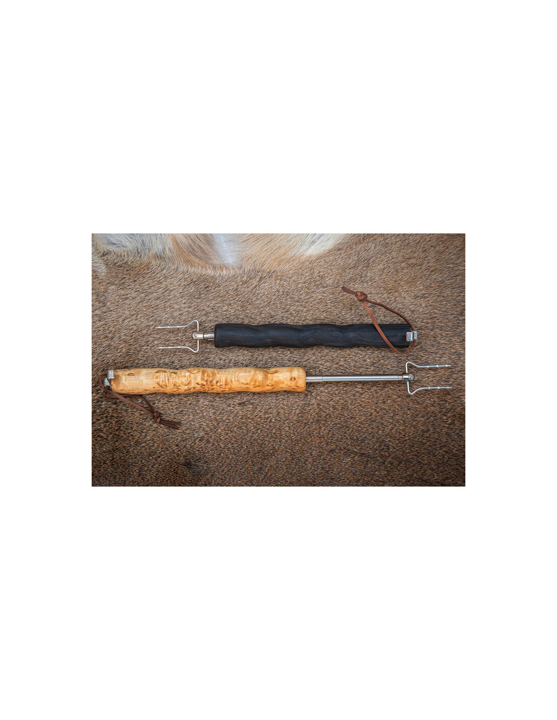 En snygg teleskopisk ej roterande grillpinne tillverkad av masurbjörk och rostfritt stål.