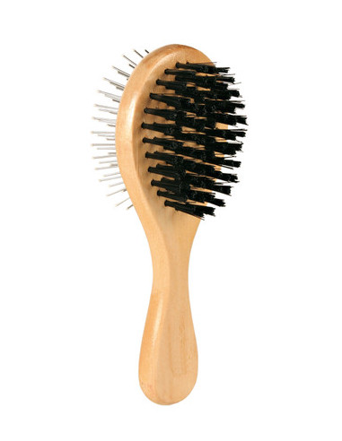 En dubbelsidig borste med tråd- och nylonborst för skonsam pälsvård. Trådsidan lämpar sig för grövre pälsutredning medan nylonborsten lämpar sig för finare pälsvård.