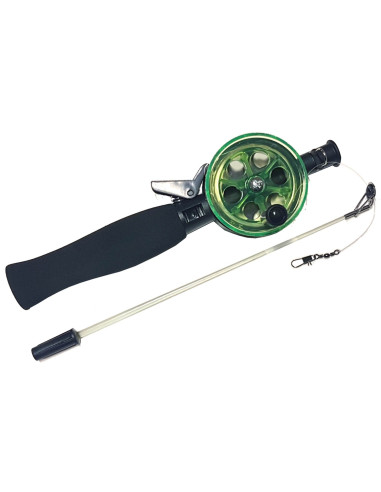 Delbart pimpelspö med 50mm spoldiameter, påspolad lina 30 m 0,30mm med beteslås fastknytt.