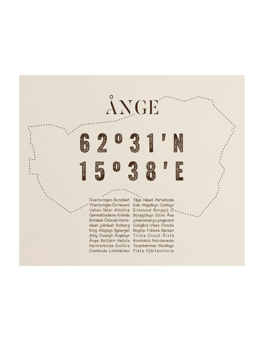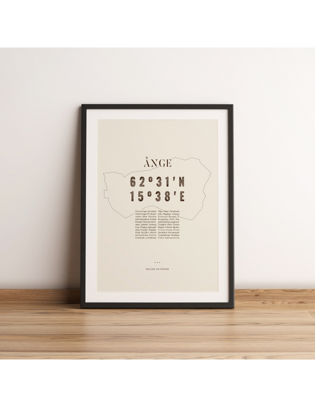 EKLIDS x ÅNGE Poster är en hyllning till vår fina kommun, med kommungränsens linjer som ramar in kommunens koordinater.