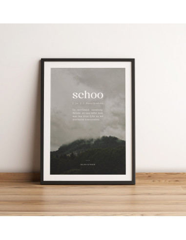 SCHOO DICTIONARY Poster är en ny tappning på vår populära 'Schoo!' layout, denna gång med vår tolkning på hur det skulle vara att slå upp norrlänningarnas favoritord i ordlistan. I bakgrunden är det Goat Mountain, eller Getberget som det heter, är den plats där de allra flesta Ångebor lär sig att åka slalom, och utsikten är oslagbar.