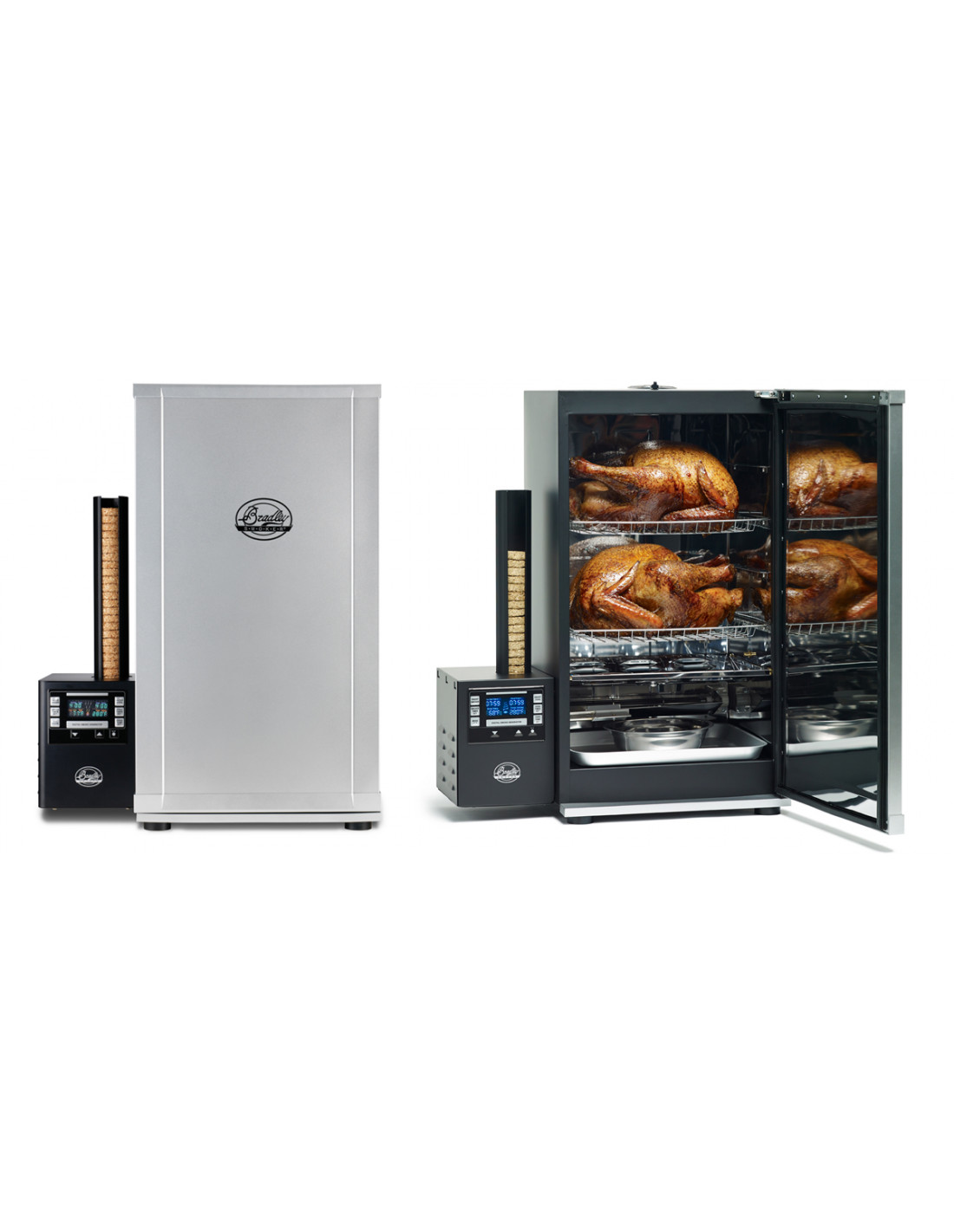 Den digitala modellens framsida har ett utseende som ser ut som borstat rostfritt. Insidan är av rostfritt stål. Precis som på Bradley Smoker Original är skåpet isolerat. Bradleys extra galler och jerky galler passar dessa modeller. Andra tillbehör finns också.