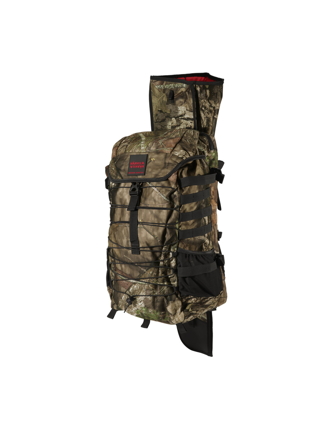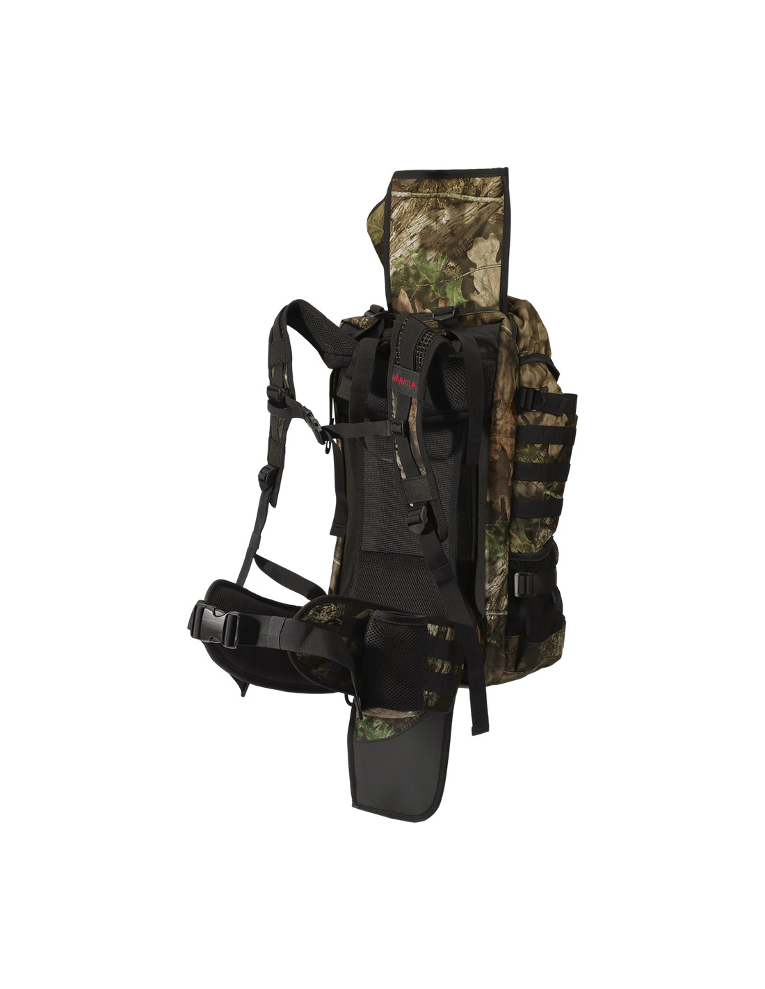 Ryggsäcken har en avtagbar hållare för en studsare eller ett hagelgevär, så att man kan bära sitt vapen på ryggen och ha det lättåtkomligt vid behov. Ryggsäckens bärremmar är breda och platta så att du kan skjuta med ryggsäcken på, utan att störas av remmarna när du lägger vapnet mot axeln. Remmarna är, liksom ryggpanelen och den kraftiga höftremmen, ventilerande så att fukt från kroppen effektivt leds bort under hög aktivitet. På sidorna har ryggsäcken kompressionsremmar och två fack för vattenflaskor eller annan utrustning. Fram har ryggsäcken dessutom en elastisk rem som både kan användas för att komprimera ryggsäcken och för att spänna fast diverse utrustning. Ryggsäckens lock har klickspänne. Under locket finns både ett dolt fack och snölås. Ryggsäcken är fodrad med röd kraftfull polyester som gör det enkelt för dig att se innehållet även i svagt ljus. Både ryggsäckens sidor och den breda höftremmen har MOLLE-system så att du kan spänna fast diverse utrustning. En GPS-hållare som kan fästas i MOLLE-systemet medföljer. I klicksystemet på bärremmarna sitter en nödvisselpipa.