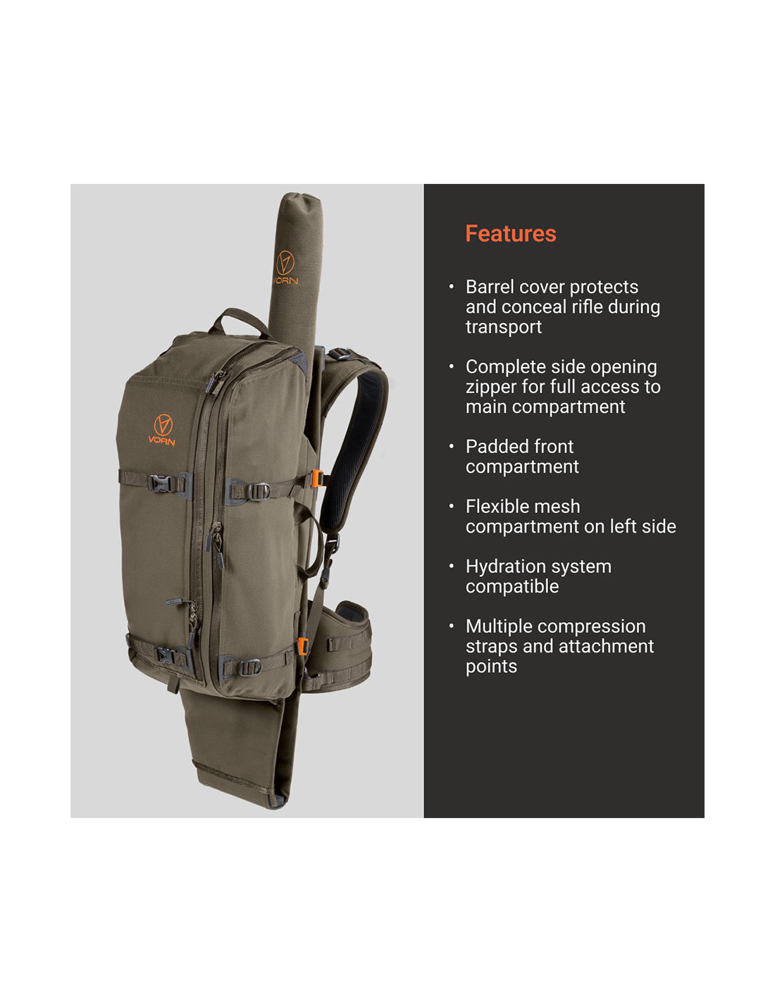 Den högkvalitativa jaktryggsäcken VORN EV30 imponerar med sitt robusta bomullsmaterial och stabila polymerram . Norsk precision bevisas också i det lättanvända QRR-systemet (Quick Rifle Release system). QRR-systemet är en innovativ VORN-höjdpunkt; genom att dra i ringen på vänster axelrem frigörs geväret från sitt säkra och vadderade fäste och kan snabbt tas i bruk. Speciellt vid smygjakt eller fjälljakt går ingen chans att fånga vilt förlorad. Vapenfacket är lämpligt för gevär och hagelgevär, även med målkikare eller tvåben.