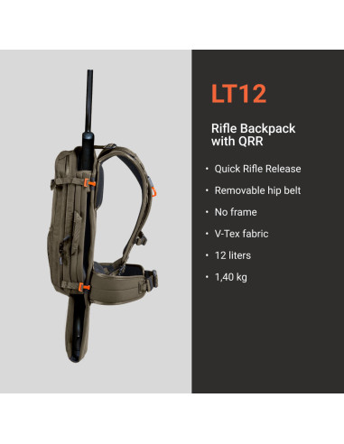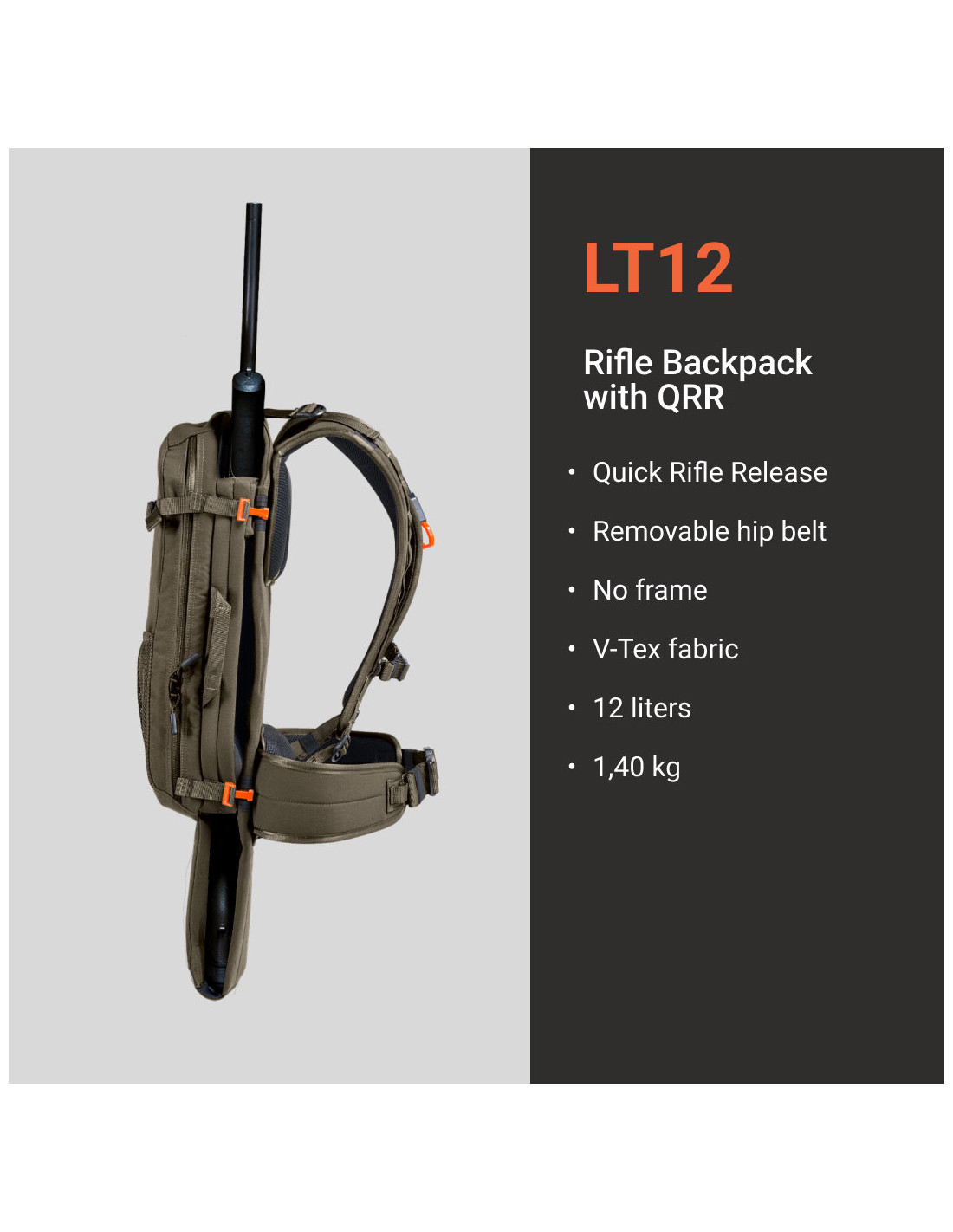 Den kompakta jaktryggsäcken VORN LT12 erbjuder 12 liters volym för jakttillbehör. Huvudfacket är åtkomligt från sidan och erbjuder plats för en vätskebehållare med upp till 3 liter . Det finns en extra nätficka på framsidan av ryggsäcken, vilket ger snabb åtkomst till kikare eller regnjacka.