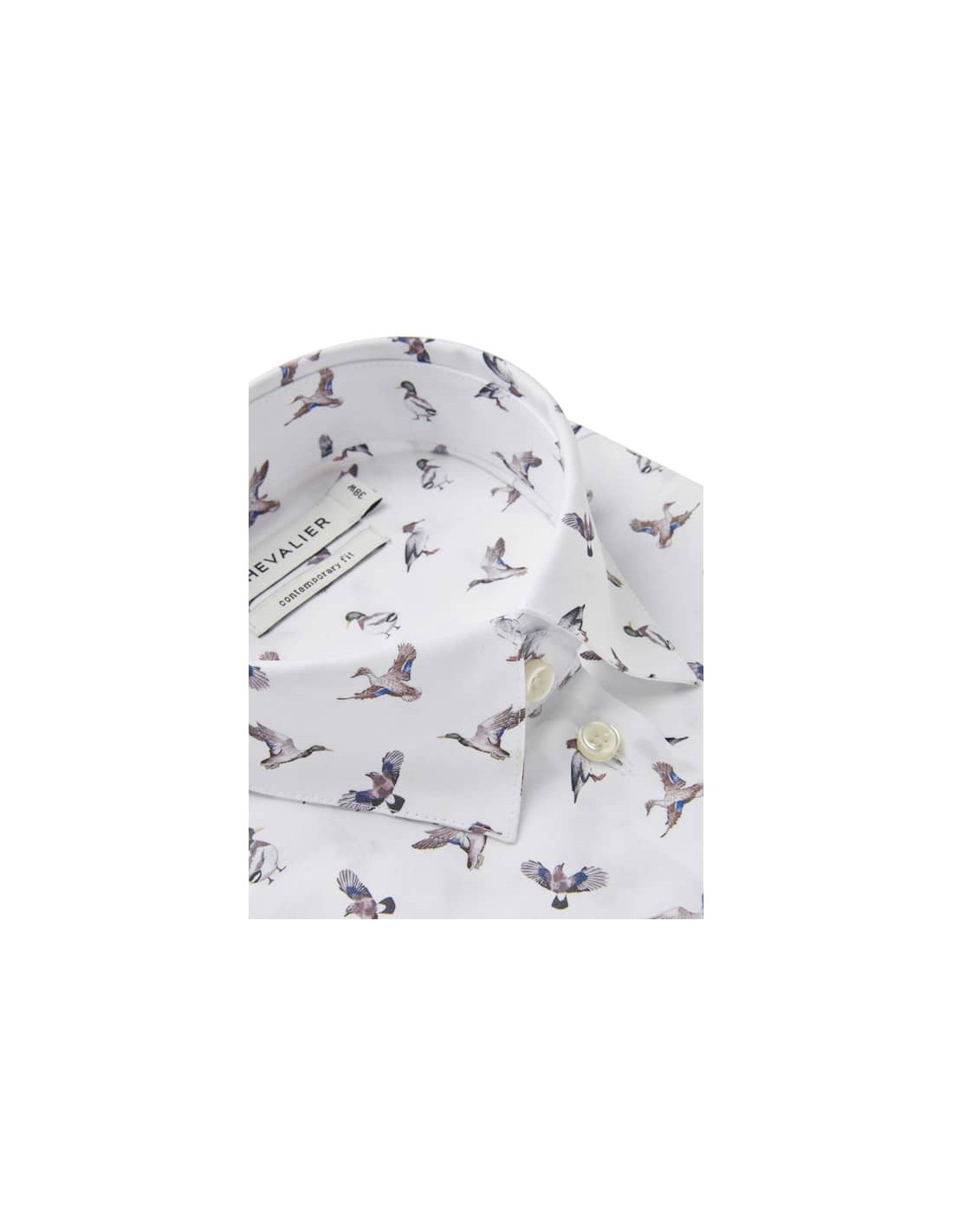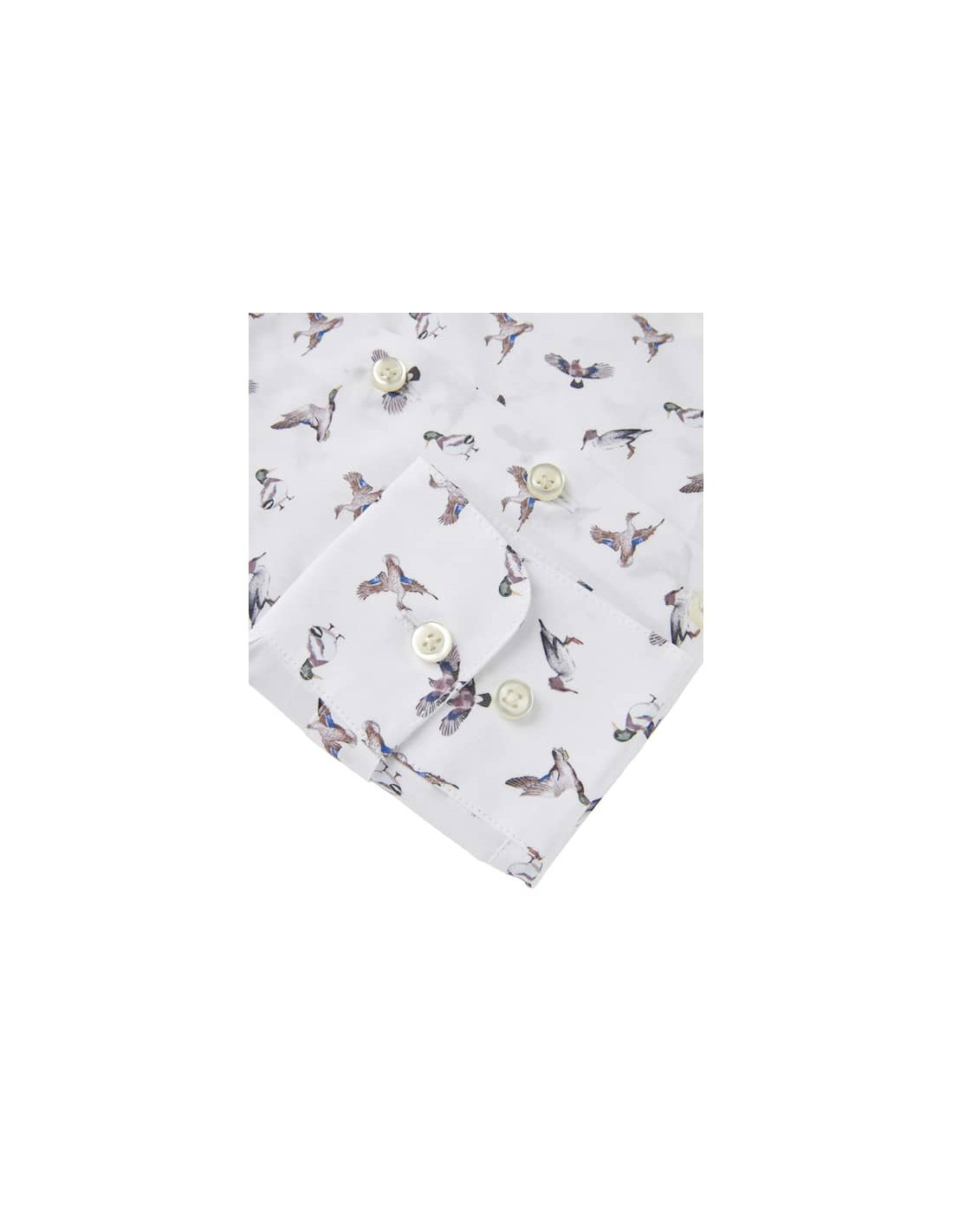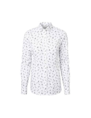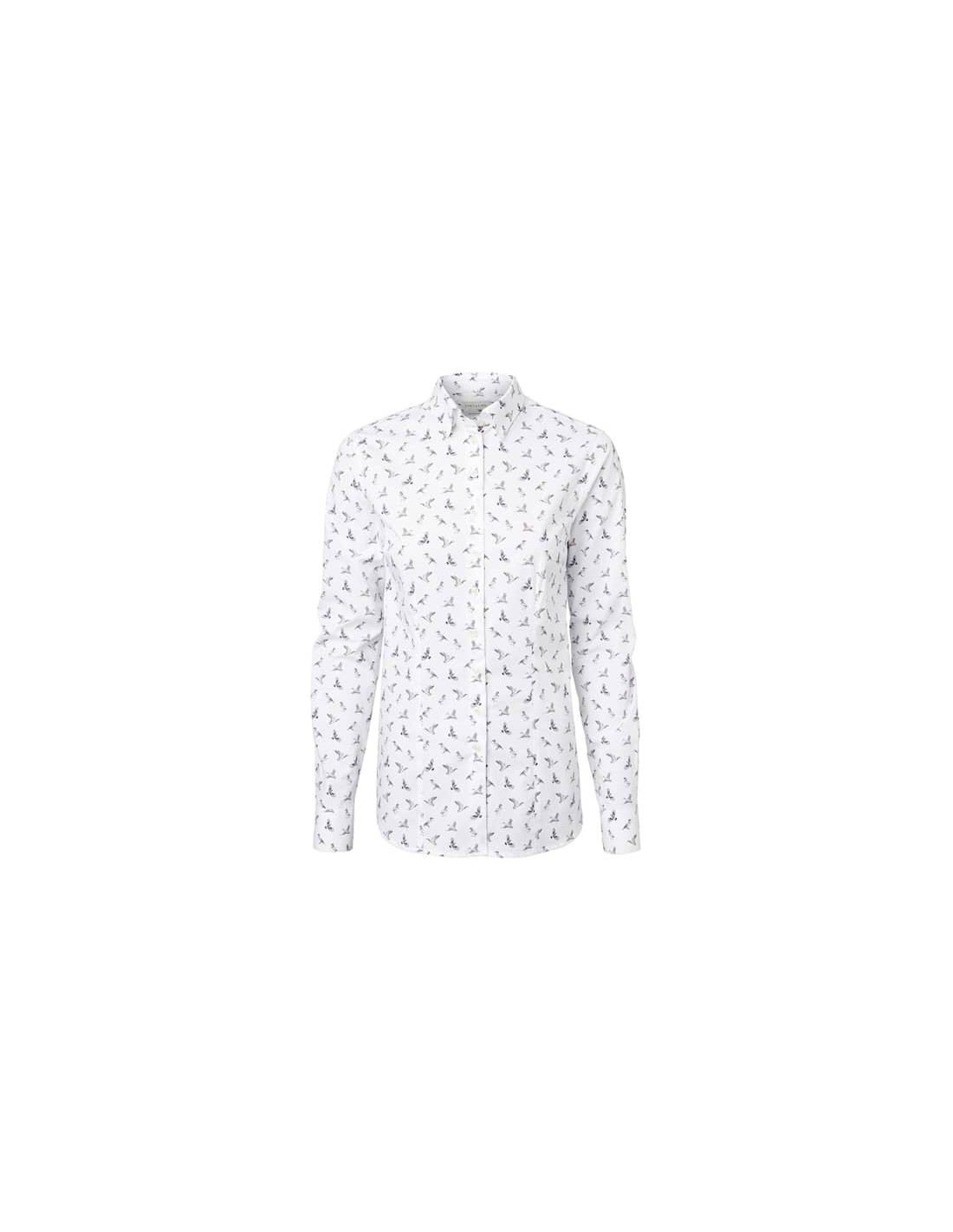 Ekologisk bomull med inblandning av elastan vilket ger stretch, rörlighet och komfort. Skjortan har ett vackert och unikt print. Kragsnibbarna hålls på plats med dolda knappar på undersidan av kragen. Modellen är något figursydd, lite insvängd i midjan, och konstruerad med en kvinnlig passform. Skjortan har extra många knappar på knappslån för att minska risken att skjortan glipar.