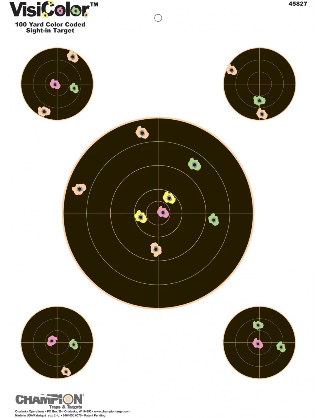 Självmarkerande tavla från Champion, perfekt för inskjutning eller bara övning. Ser träffarna på långt håll utan att använda kikare. Olika färger i ringarna för att lättare kunna se var man träffar i ringen.