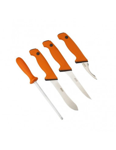 Medföljer gör även en skärpstål så att du enkelt kan hålla dina styckningsknivar vassa. Dessa kvalitetsknivar är utrustade med ett greppvänligt och slitstrakt skaft tillverkat av SantoPrene™.