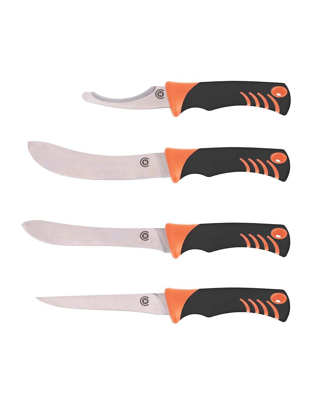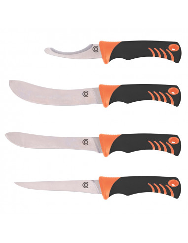 Praktiskt slaktset med tre olika knivar och buköppnare. Blad i rostfritt stål (5Cr15MoV). Slaktsetet levereras med praktiskt nylonfodral.