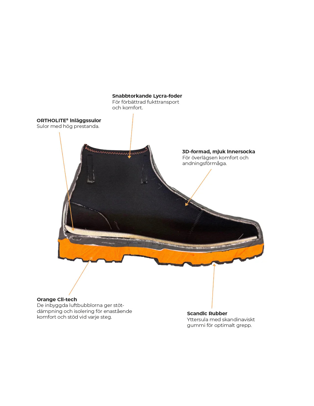 • Orange Cli-tech: en inbyggd luftkudde över hela foten för stötdämpning