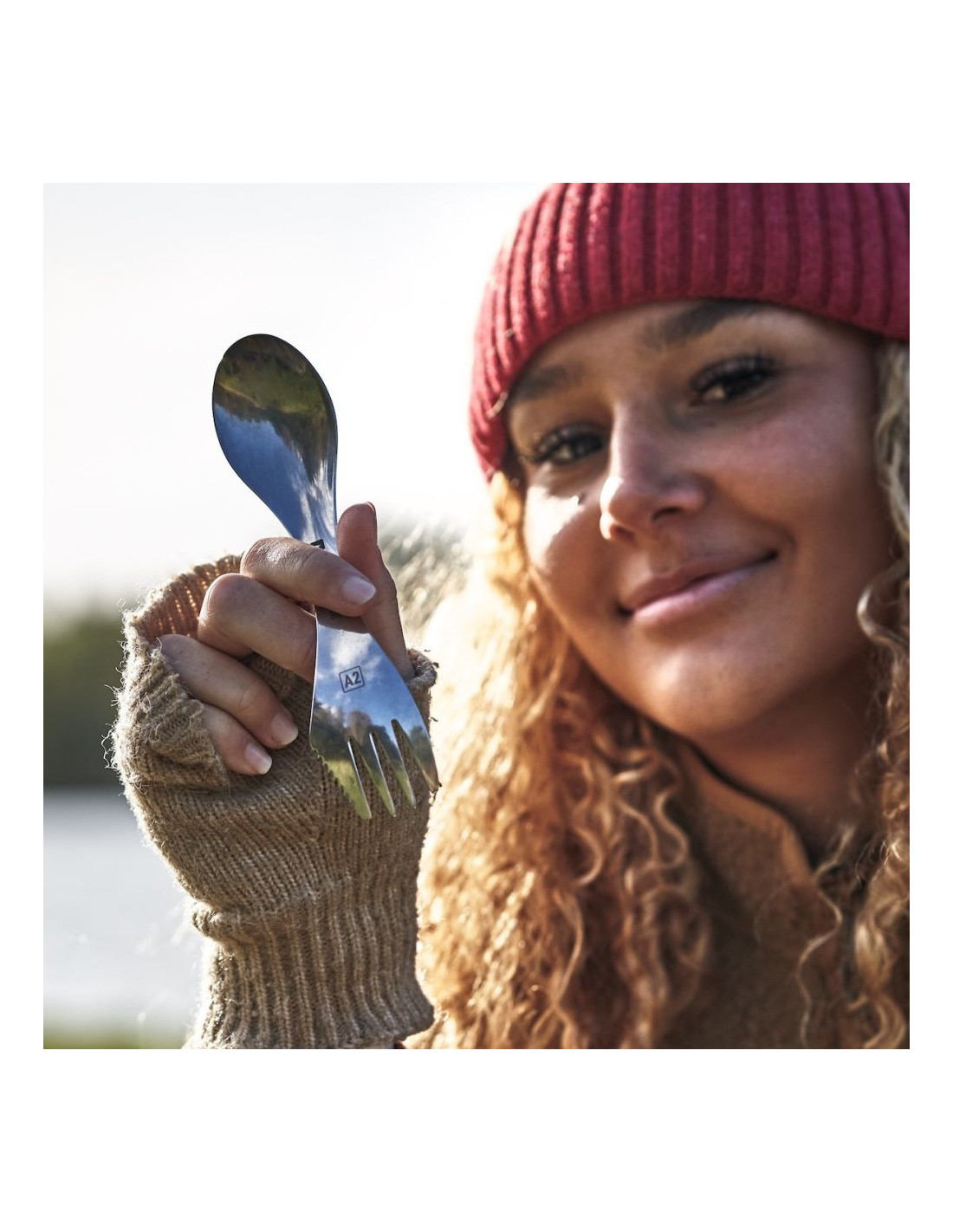 En blandning av sked, gaffel och kniv i en multifunktionell form. Designad och tillverkad i Sverige av 96 % återvunnet, 18/8 rostfritt stål, är detta robusta redskap idealiskt för att njuta av måltider under stjärnorna och ersätter vardaglig engångsplast. Den är perfekt för matlagning över indirekt värme och är gjord av restaurangkvalitet, matsäkert material som håller i generationer.
