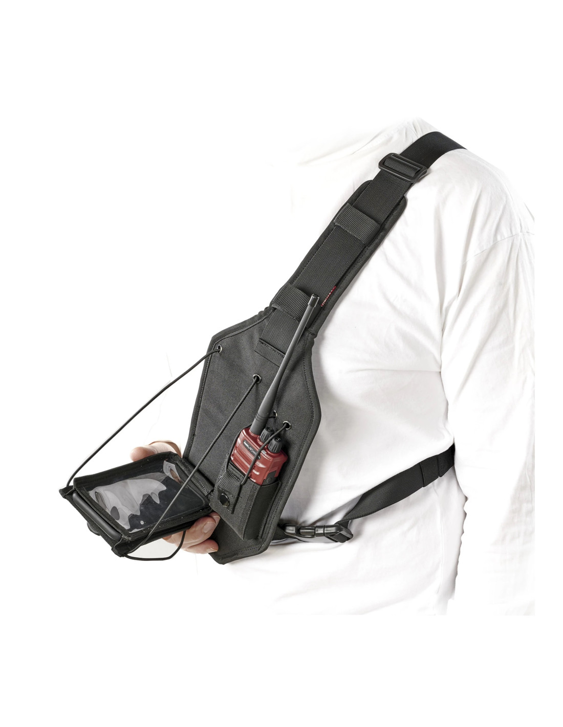 Smidig sele för jaktradio och GPS med reglerbar rygg och enkla spännen. Anpassad för både höger- och vänsterskyttar. De elastiska hållarna passar de flesta modeller. GPS-hållaren är vikbar, så att man enkelt kan ha ett öga på GPS:en. Kardborregömma för kabeln till öronmusslan. Fäste för skogsantenn.