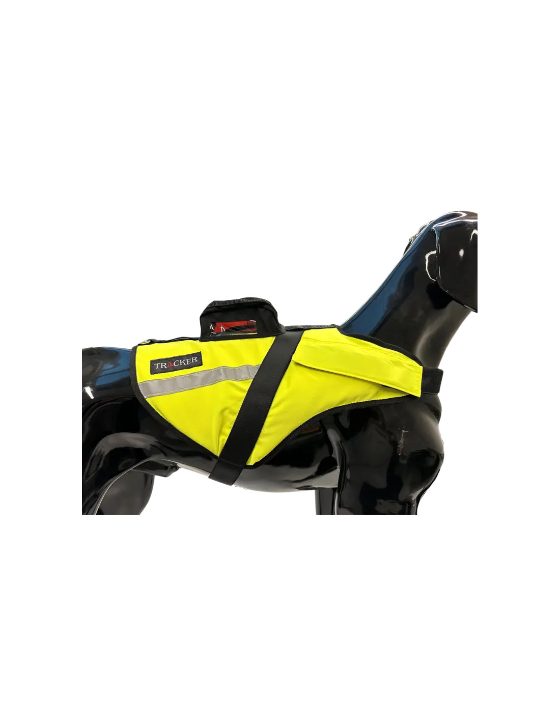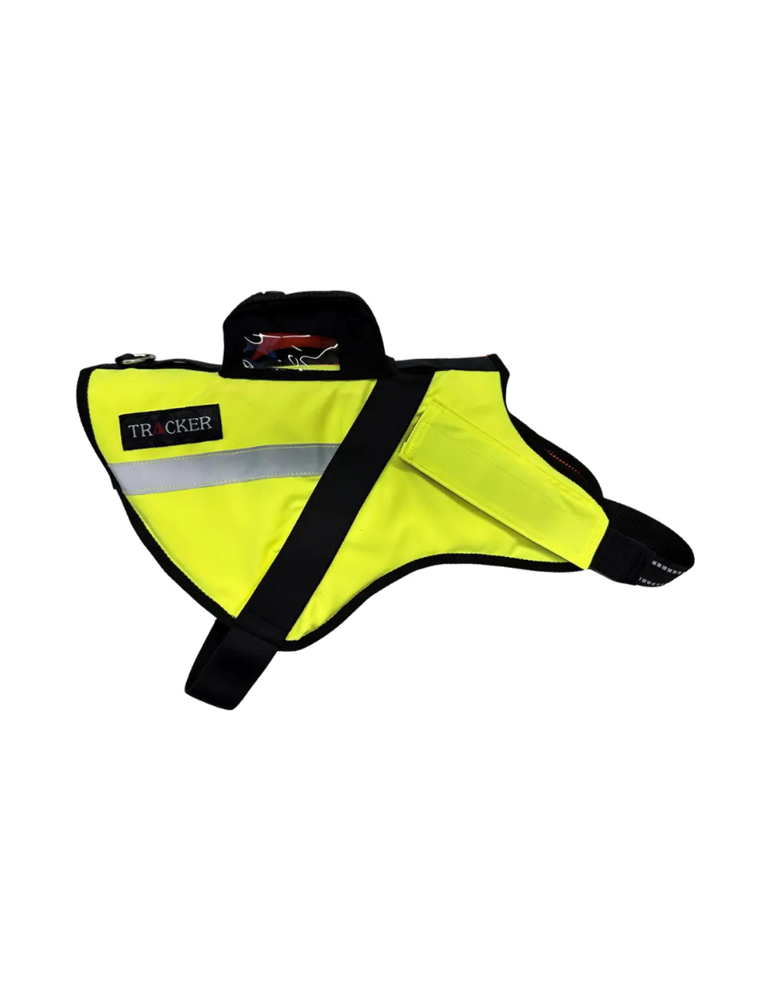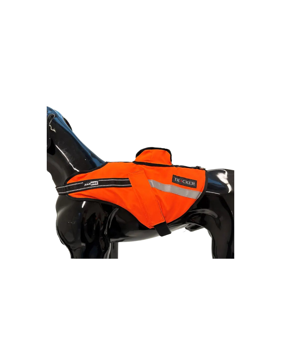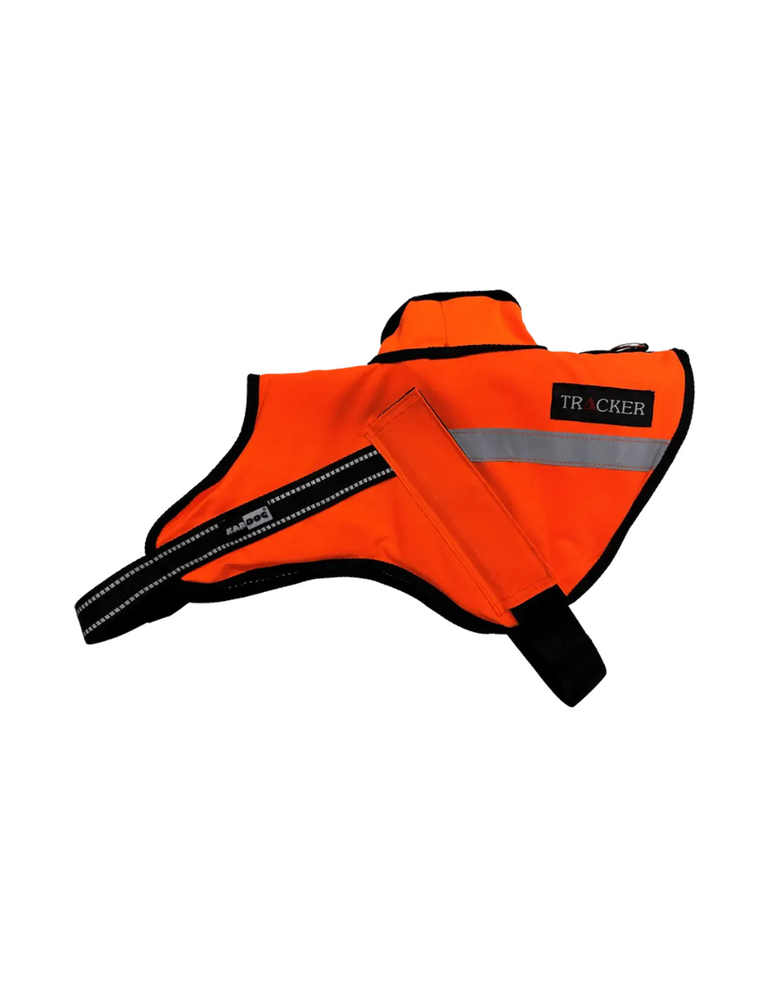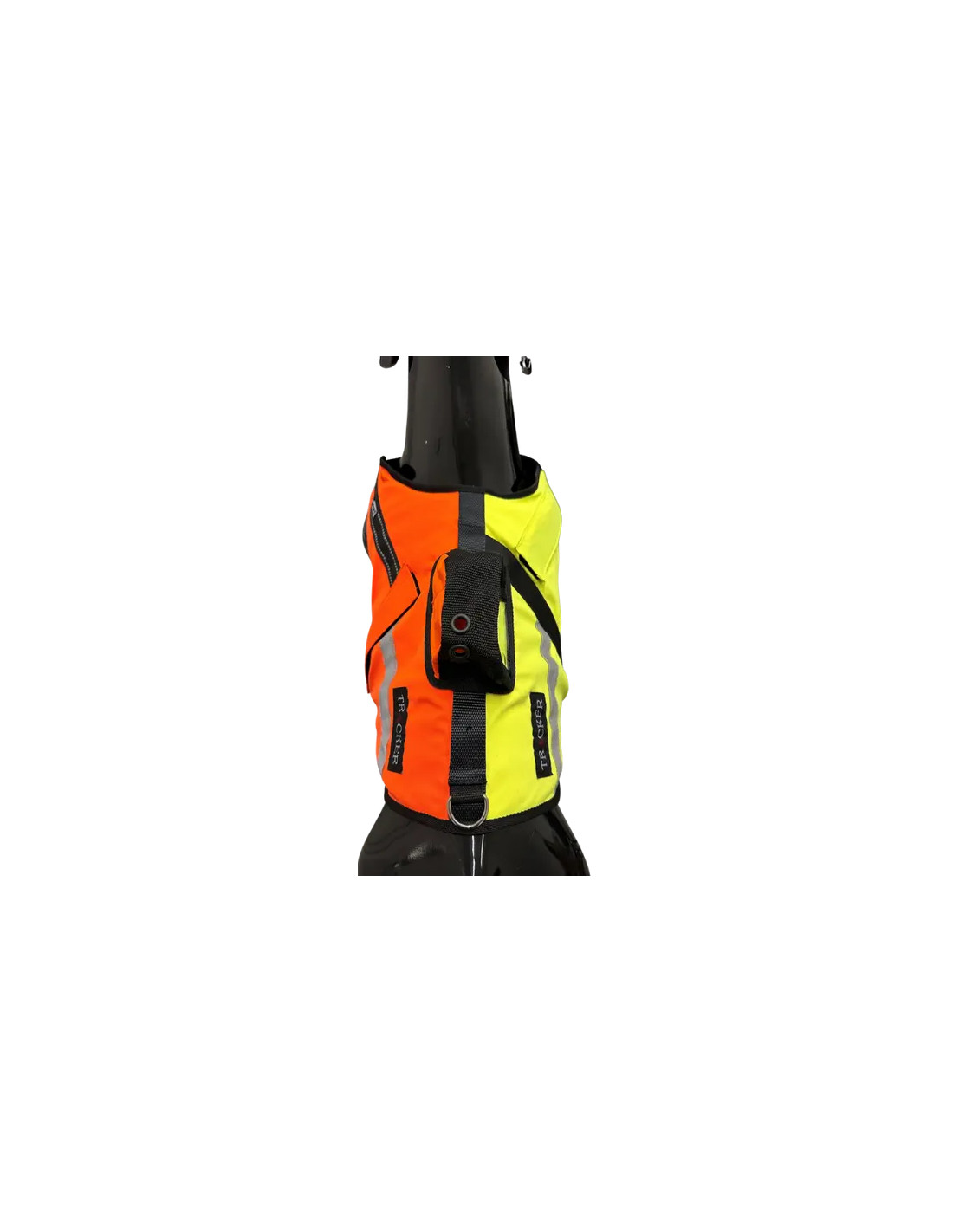 Västen har även en specifik plats för Tracker Bark bakom huvudfickan, vilket möjliggör användning av både Bark-enheten och en annan GPS-enhet samtidigt. Tvåfärgad design med starka varselfärger ökar synligheten, och det finns även plats för ett Orbiloc-varselljus på framsidan av enhetsfickan.