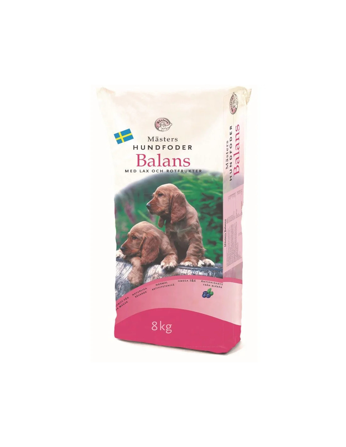 Mästers Balans är ett svensktillverkat spannmålsfritt helfoder med lax, sötpotatis, morötter och blåbär. Innehåller skonsamma och lättsmälta råvaror, passar hundar med en normal aktivitetsnivå. Detta foder passar utmärkt för kräsna hundar samt hundar som är känsliga mot spannmål. Fodret är berikat med omega 3 och 6 fettsyror som ger en frisk hud och glansig päls. Med sötpotatis som kolhydratkälla är fodret lättsmält och skonsamt. Fodret innehåller även blåbär och frukto-oligosackariden Profeed som samverkar för ett starkt immunförsvar och god tarmhälsa.