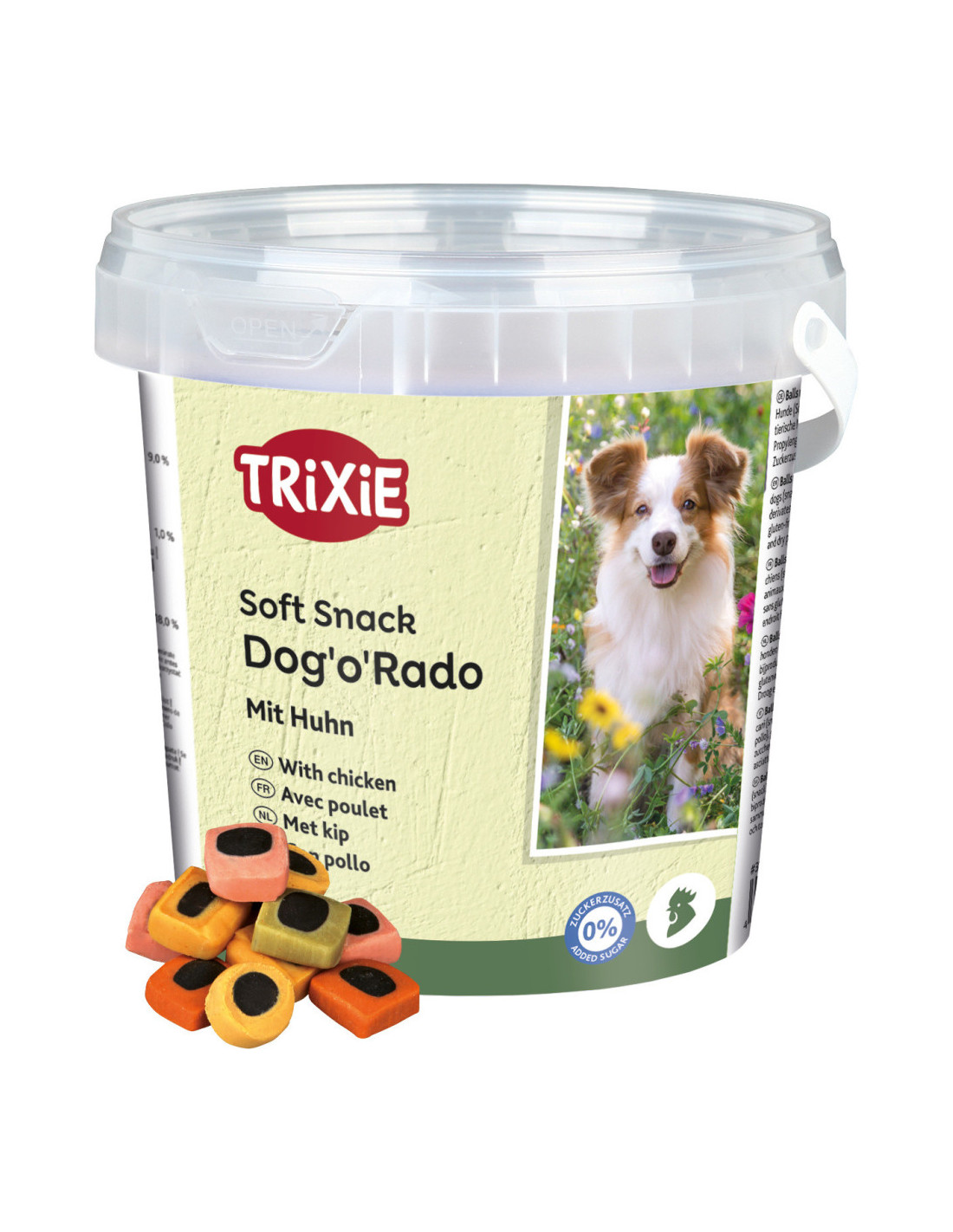Spannmål, kött och animaliska biprodukter (4% kyckling), vegetabiliska biprodukter, oljor och fetter, mineraler.