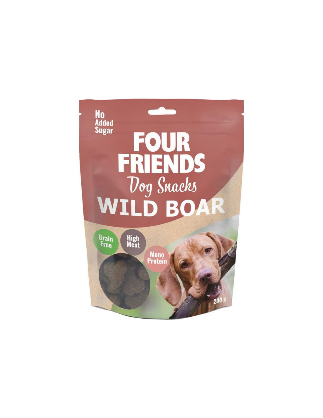 Torkat vildsvinskött, Ärtor, Torkade äpplen, Kycklingfett (siktat och helt fritt från protein samt konserverat med blandade tokoferoler), 4% Torkad tranbär, 4% Linfrö, 1% Laxolja (silat och helt fritt från protein).