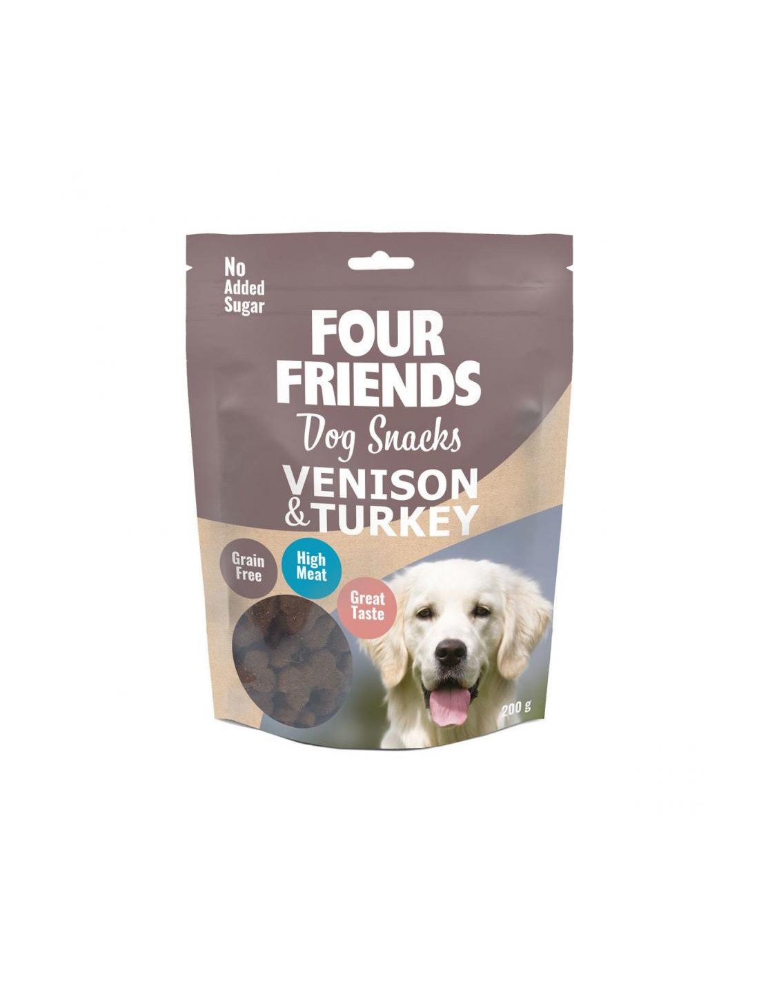 Torkat hjortkött, Torkat kalkonkött, Ärtor, Torkade äpplen, Kycklingfett (silat och helt fritt från protein samt konserverat med blandande tokoferoler), 4% Torkad tranbär, 4% Linfrö, 1% Laxolja (sikta och helt fritt från protein).