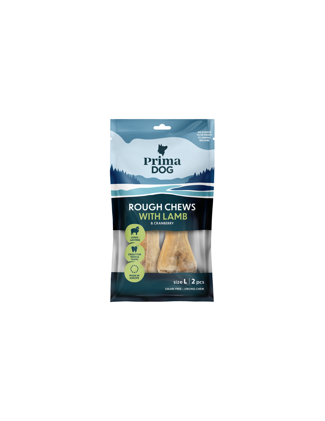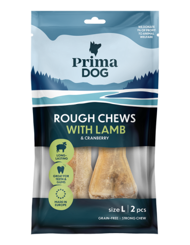 PrimaDog Rough Chews Lamm-Tranbär är ett välsmakande tuggben som stöder välmående tänder och mun. Den smakrika lammfyllningen gör tuggbenet extra läckert, och en gnutta tranbär, Nordens superbär, ger din hund ett naturligt tillskott av vitamin C.